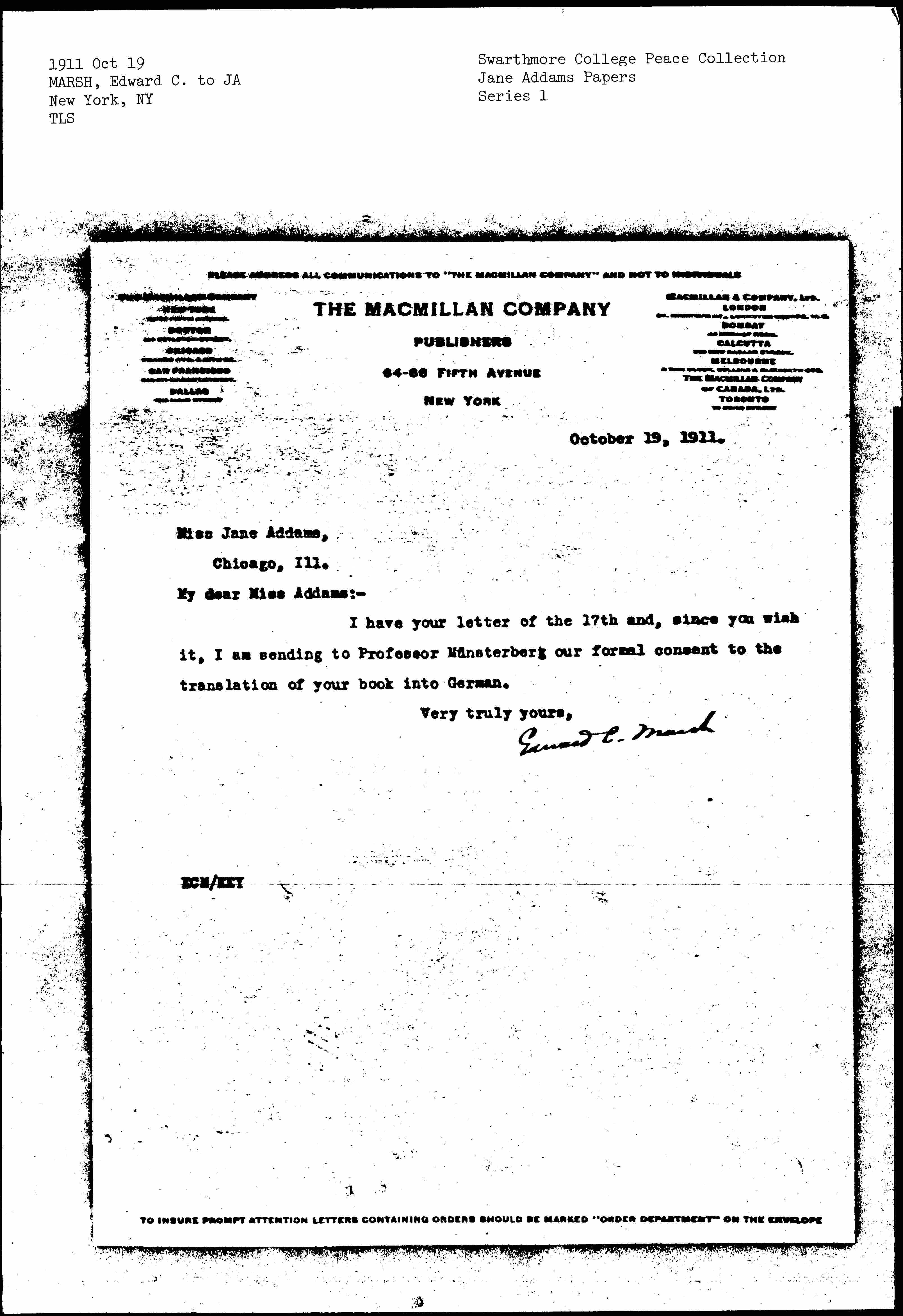 I have your letter of the 17th and, since you wish it, I am sending to Professor Münsterberg our formal consent to the translation of your book into German.