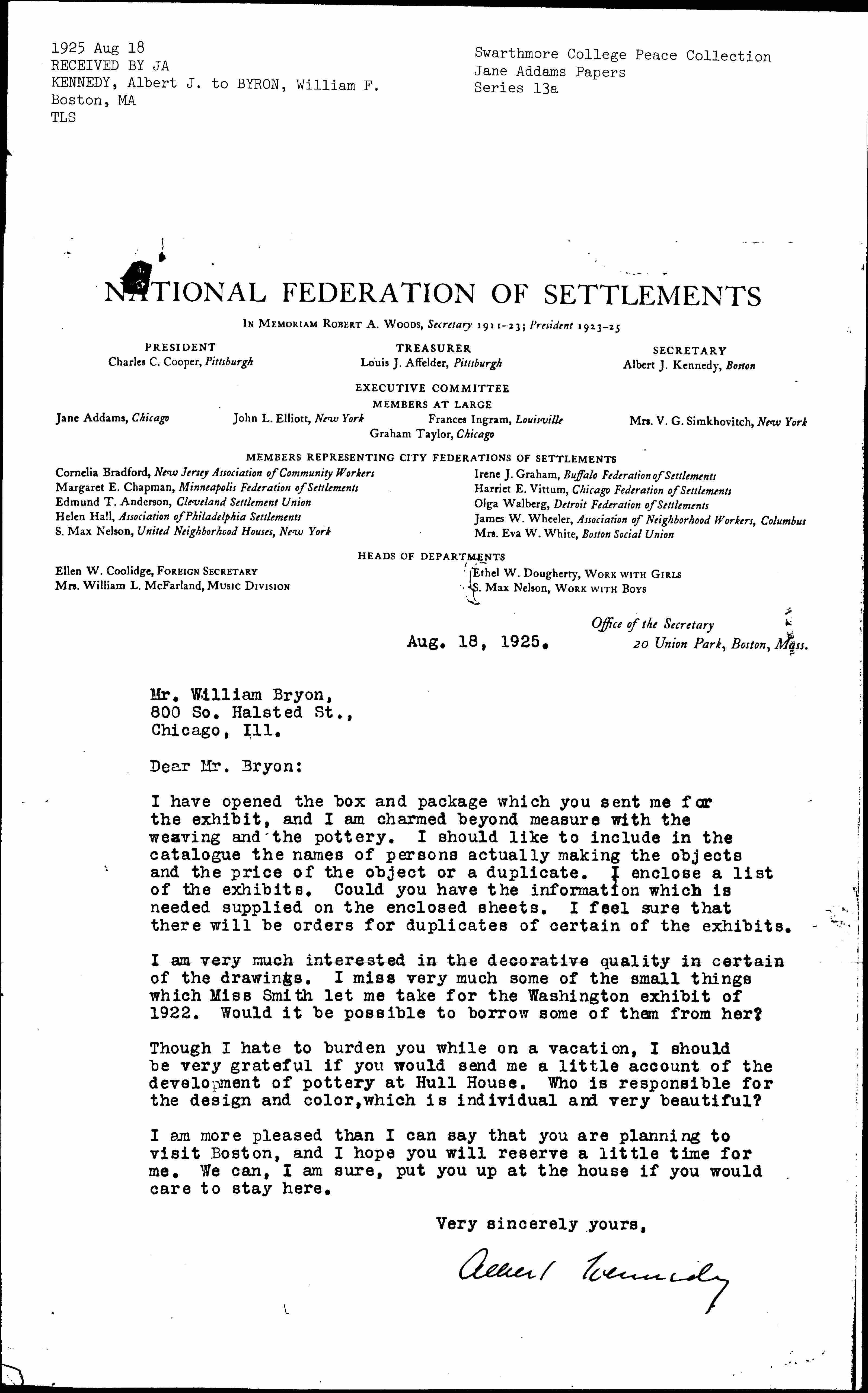 Though I hate to burden you while on a vacation, I should be very grateful if you would send me a little account of the development of pottery at Hull House. Who is responsible for the design and color, which is individual and very beautiful?