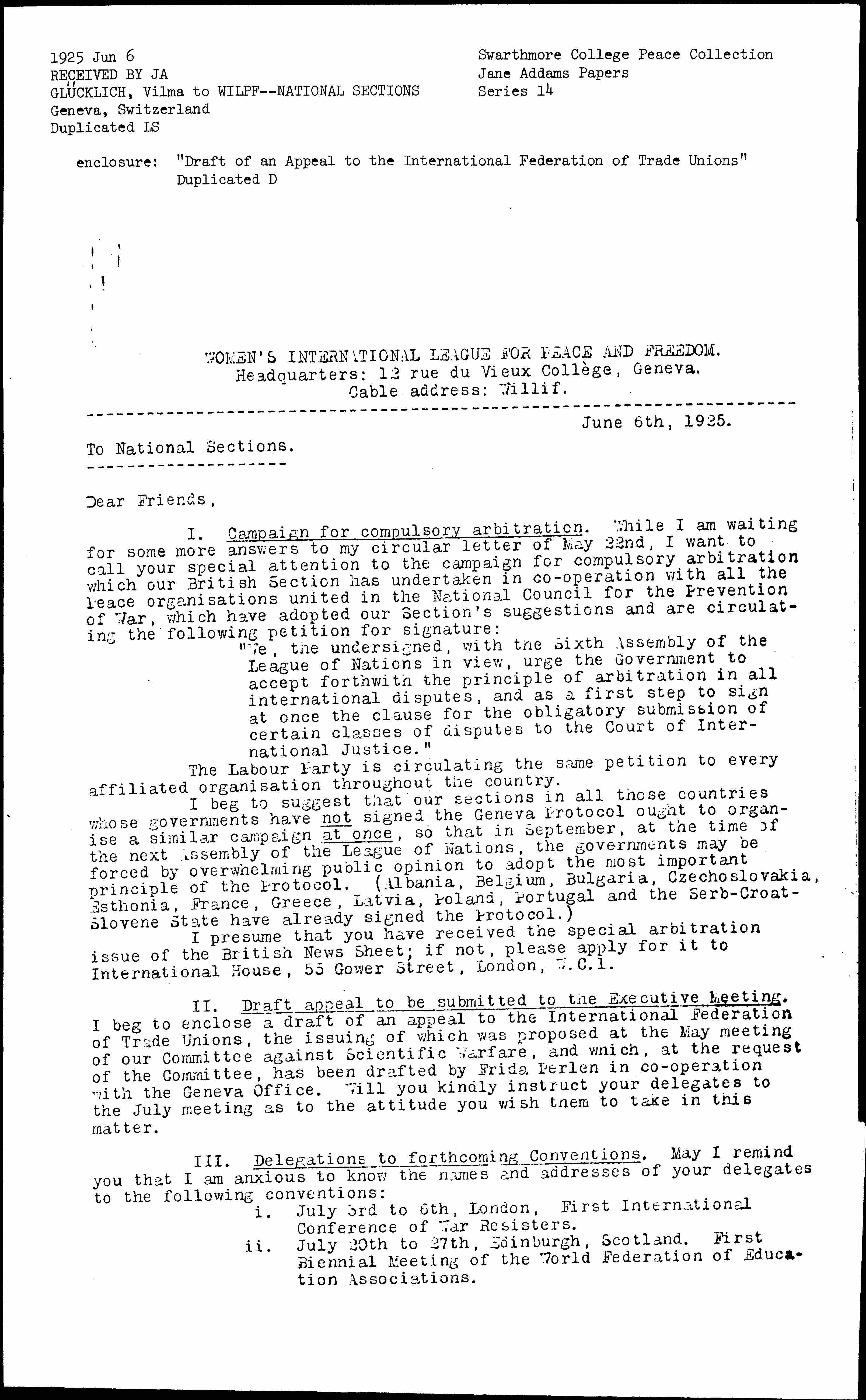 I. Campaign for compulsory arbitration. While I am waiting for some answers to my circular letter of May 22nd, I want to call your special attention to the campaign for compulsory arbitration which our British Section has undertaken in [cooperation] with all the Peace [organizations] united in the National Council for the Prevention of War, which have adopted our Section's suggestions and are circulating the following petition for signature: