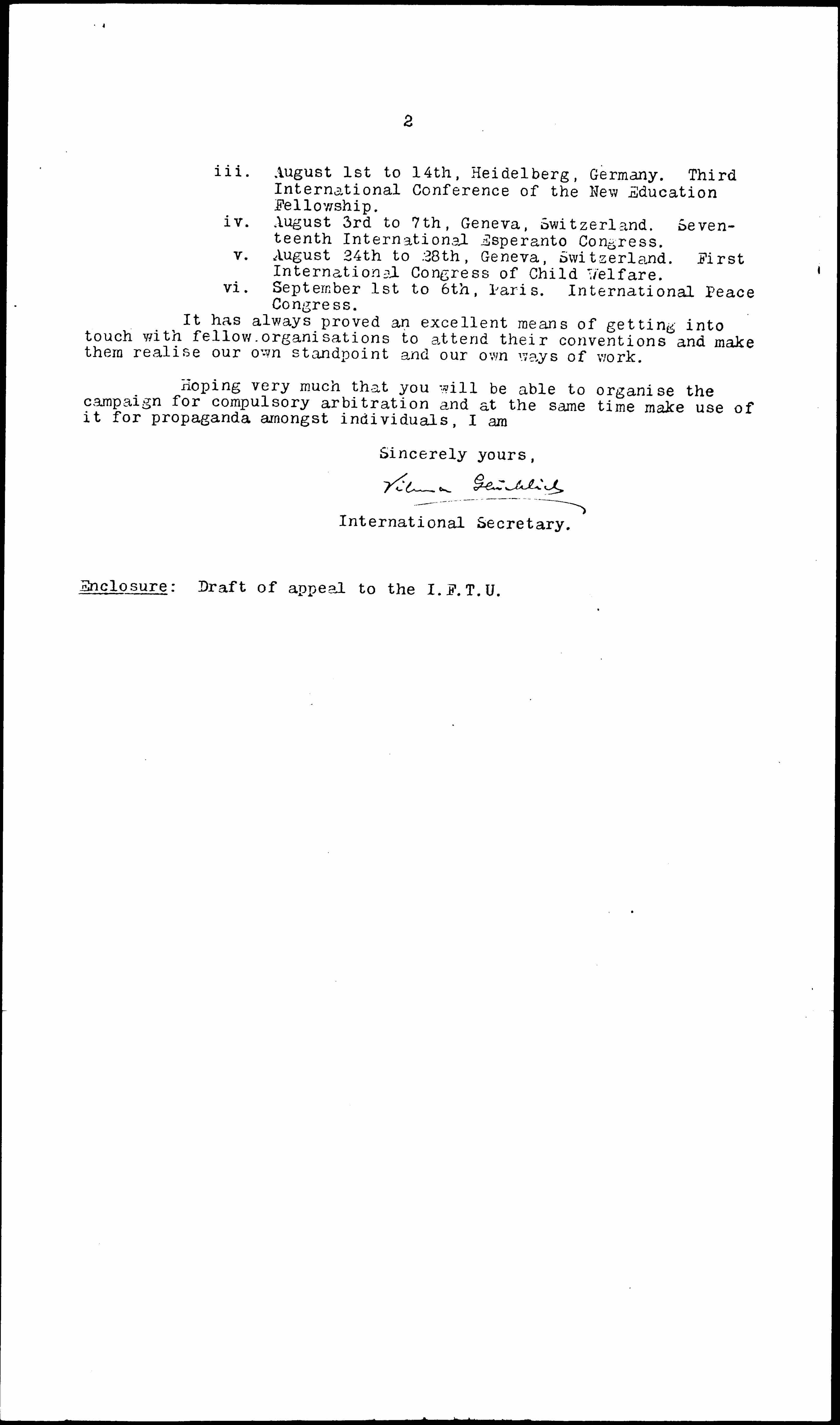 I beg to suggest that our sections in all those countries whose governments have not signed the Geneva Protocol ought to [organize] a similar campaign at once, so that in September, at the time of the next Assembly of the League of Nations, the governments may be forced by overwhelming public opinion to adopt the most important principle of the Protocol. (Albania, Belgium, Bulgaria, Czechoslovakia, [Estonia], France, Greece, Latvia, Poland, Portugal and the Serb-Croat-Slovene State have already signed the Protocol.)