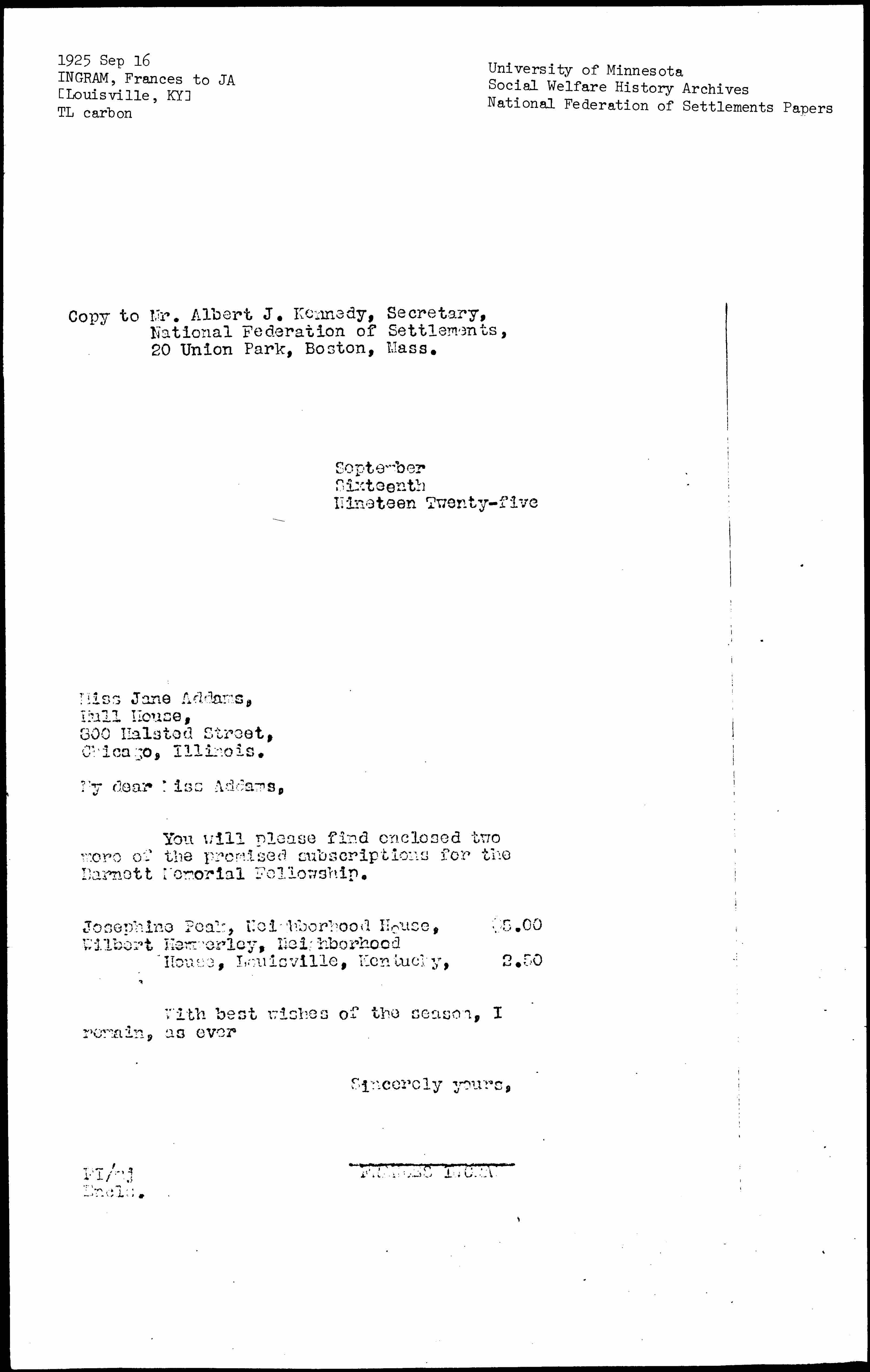 You will please find enclosed two more of the promised subscriptions for the Barnett Memorial Fellowship.