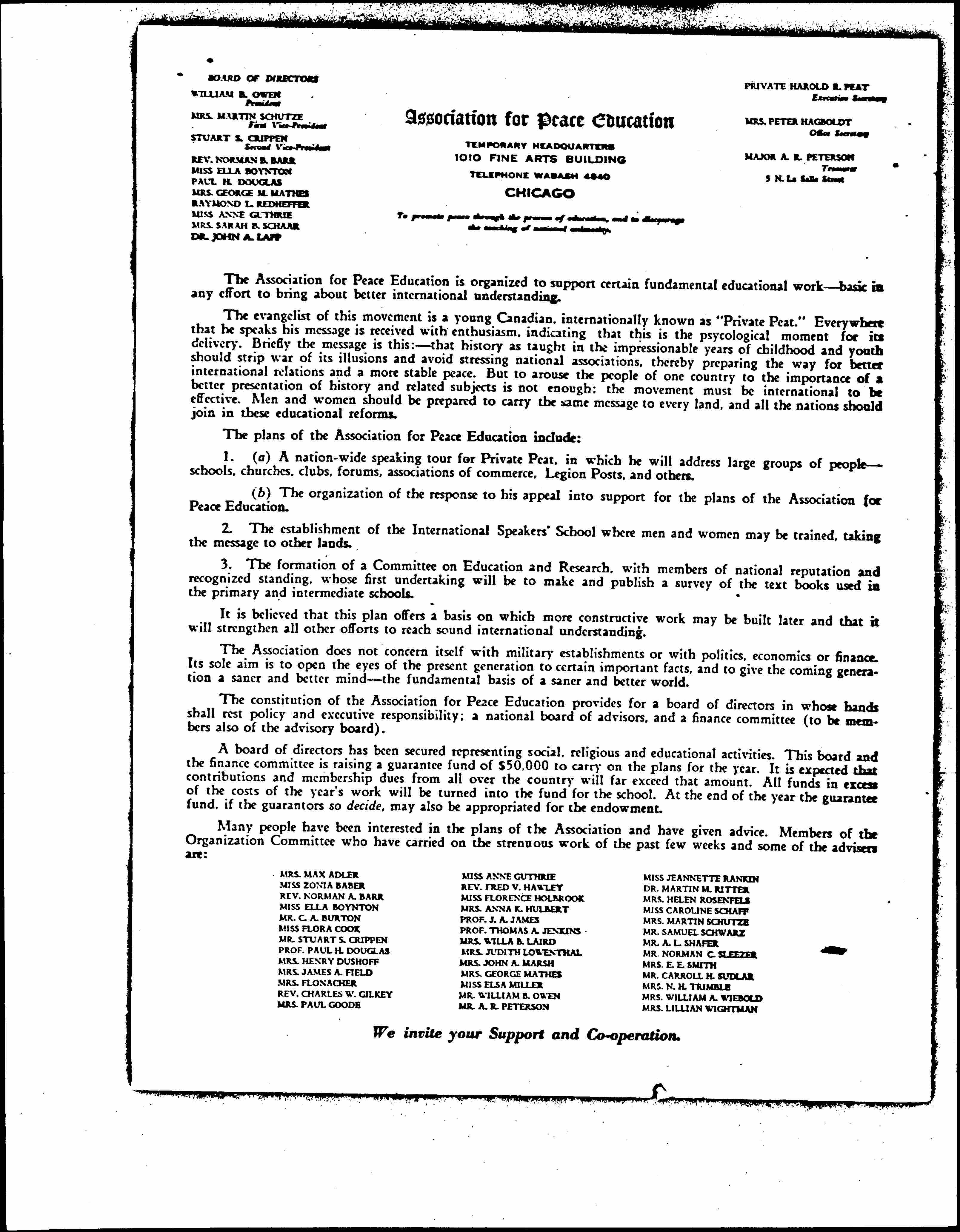 The constitution of the Association for Peace Education provides for a board of directors in whose hands shall rest policy and executive responsibility; a national board of advisors, and a finance committee (to be members also of the advisory board).