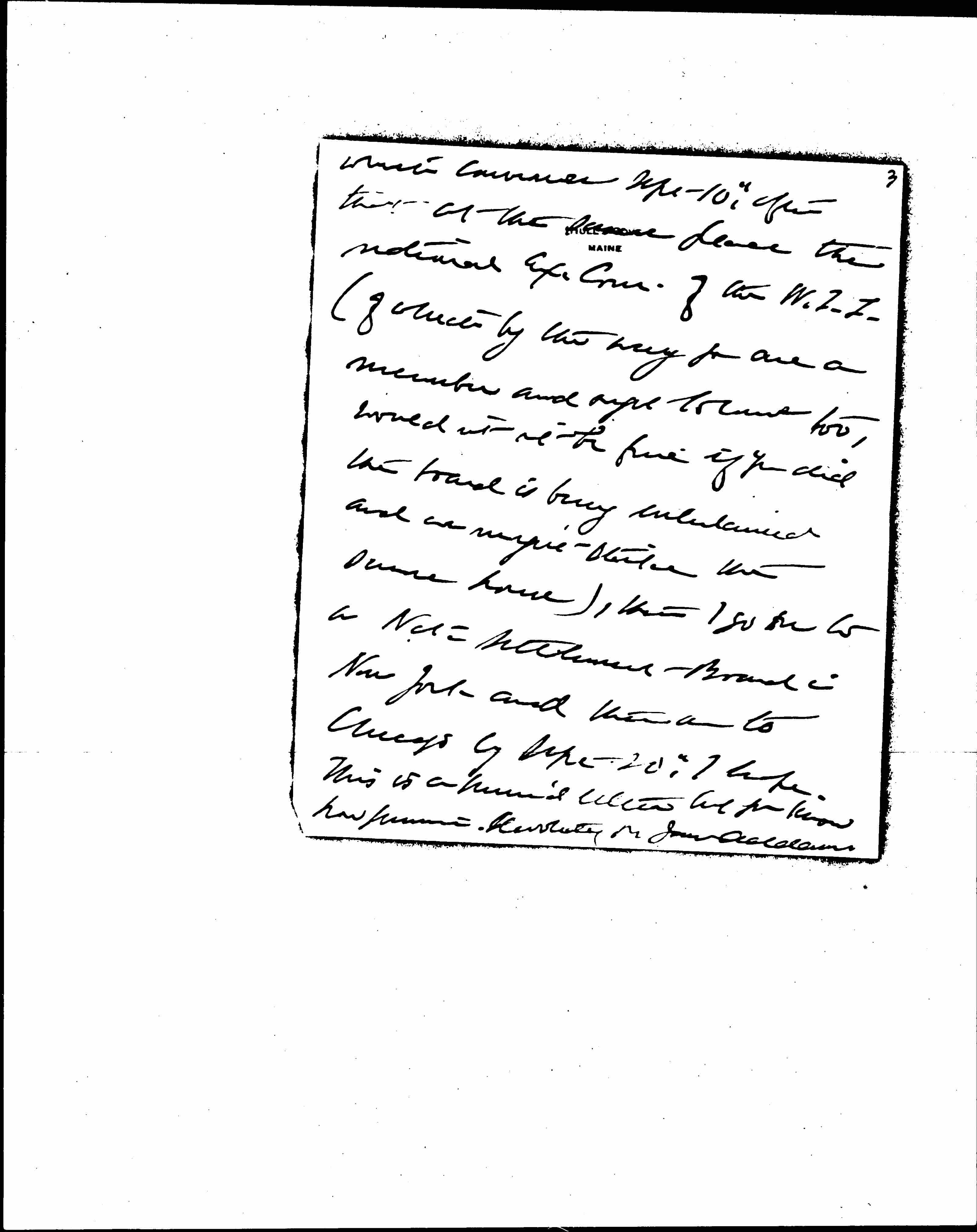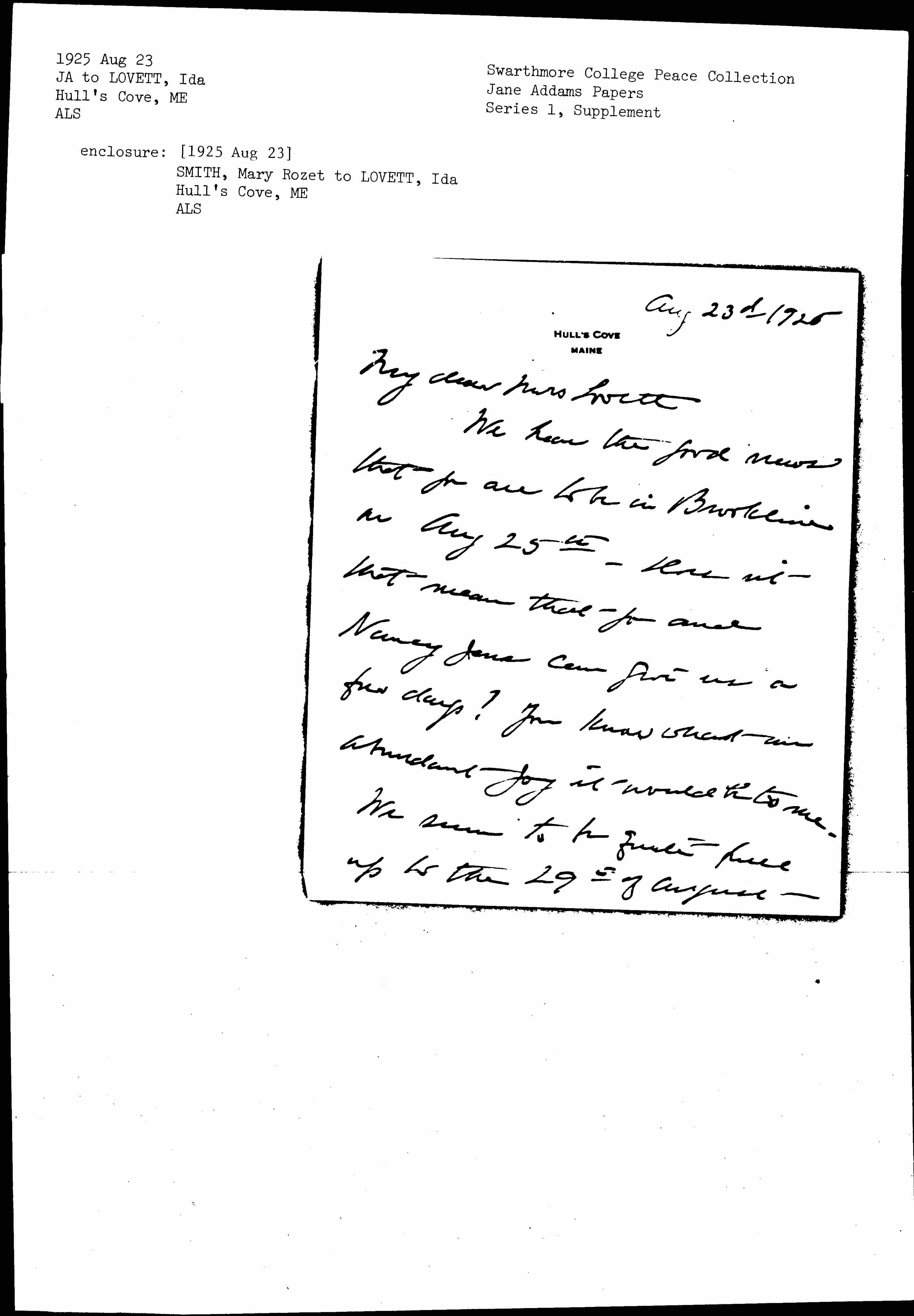 I am going down to Swarthmore for the annual meeting of the Fellowship of Reconciliation [page 3] which commences Sept 10", after that at the same place the national Ex. Com. of the W.I.L. (of which by the way you are a member and ought to come too, wouldn't it be fine if you did the board is being entertained and we might [start in?] the same house), then I go on to a Nat. Settlement Board in New York and then on to Chicago by Sept 20", I hope. This is a hurried letter but you know how genuine. Devotedly yours Jane Addams