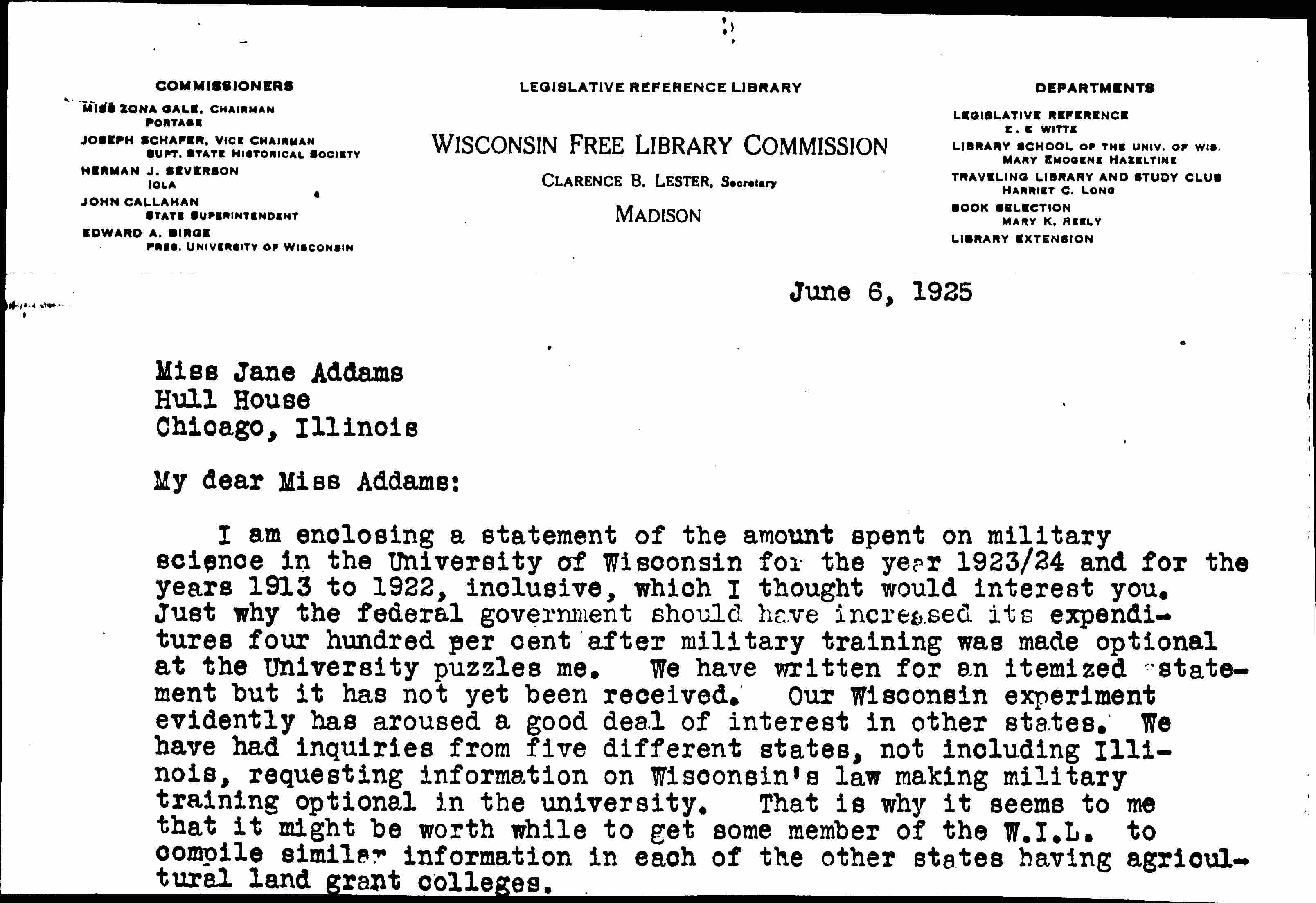 I am enclosing a statement of the amount spent on military science in the University of Wisconsin for the year 1923/24 and for the years 1913 to 1922, inclusive, which I thought would interest you. Just why the federal government should have increased its expenditures four hundred [percent] after military training was made optional at the University puzzles me. We have written an itemized statement but it has not yet been received. Our Wisconsin experiment evidently has aroused a good deal of interest in other states. We have had inquiries from five different states, not including Illinois, requesting information on Wisconsin's law making military training optional in the university. That is why it seems to me that it might be [worthwhile] to get some member of the W.I.L. to compile similar information in each of the other states having agricultural land grant colleges. [missing pages(s)?]