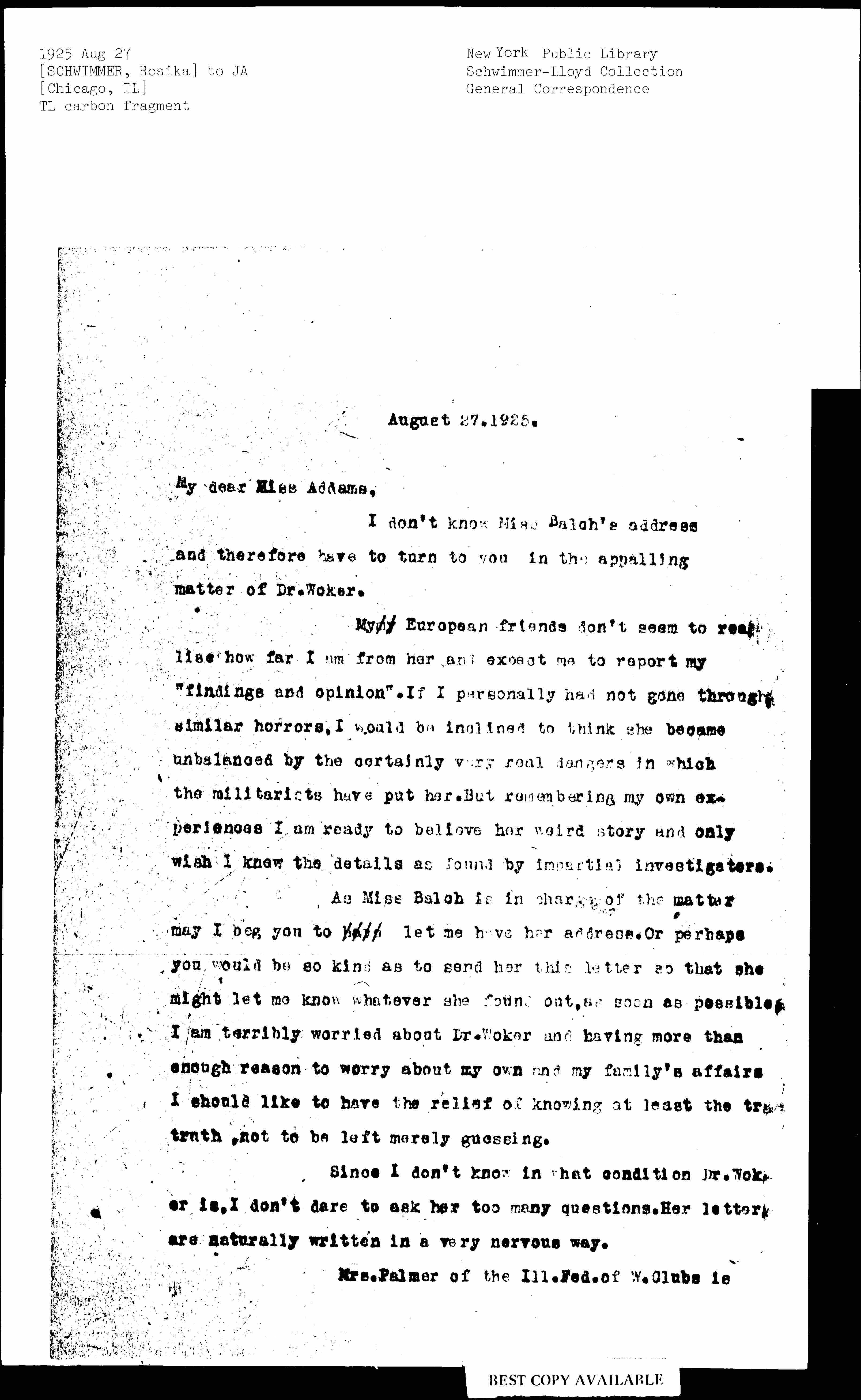 I don't know Miss Balch's address and therefore have to turn to you in the appalling matter of Dr. Woker.