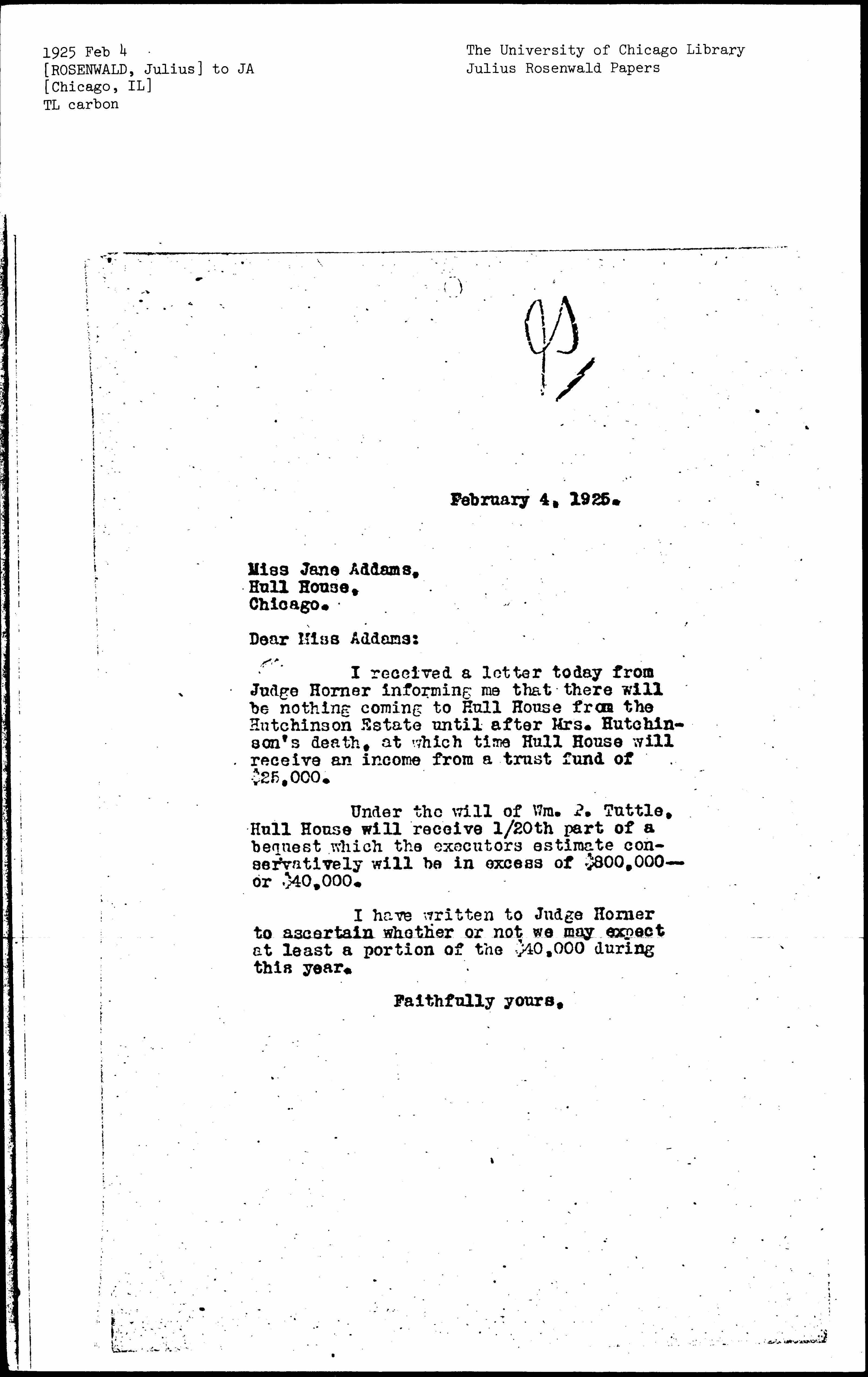 I received a letter today from Judge Horner informing me that there will be nothing coming to Hull House from the Hutchinson Estate until after Mrs. Hutchinson's death, at which time Hull House will receive an income from a trust fund of $25,000.