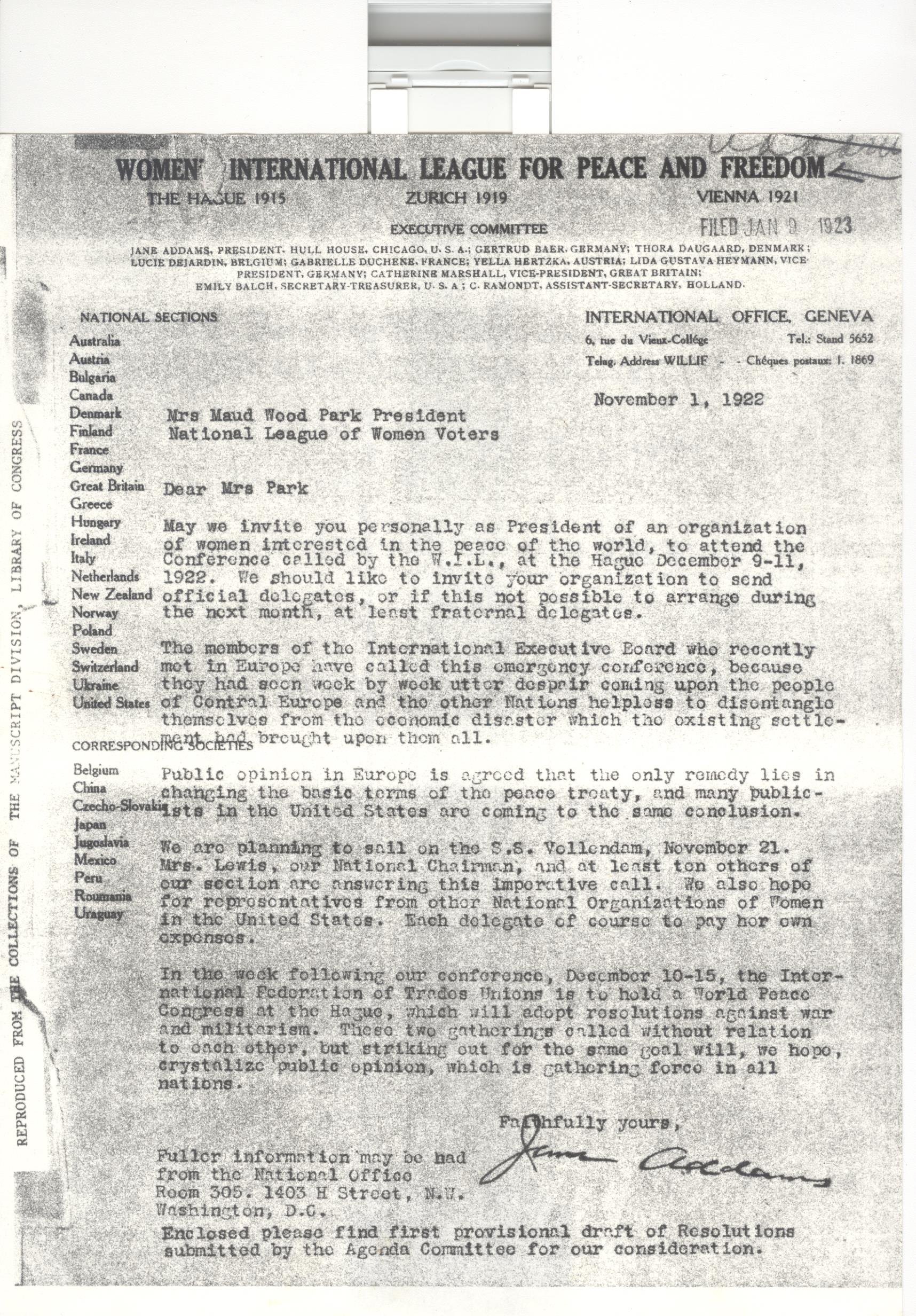May we invite you personally as President of an organization of women interested in the peace of the world, to attend the Conference called by the W.I.L., at The Hague December 9-11, 1922. We should like to invite your organization to send official delegates, or if this not possible to arrange during the next month, at least fraternal delegates.