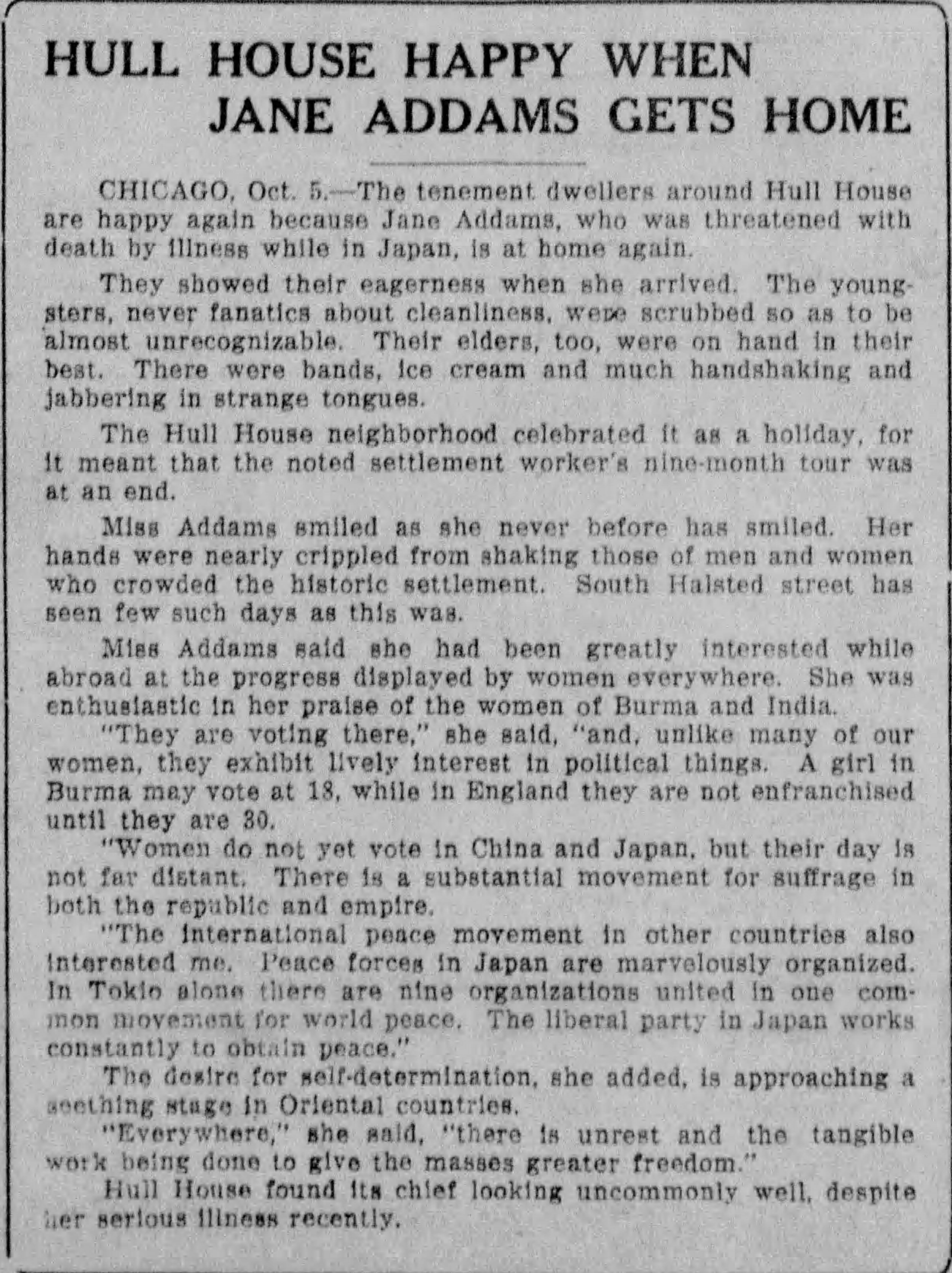 HULL HOUSE HAPPY WHEN JANE ADDAMS GETS HOME