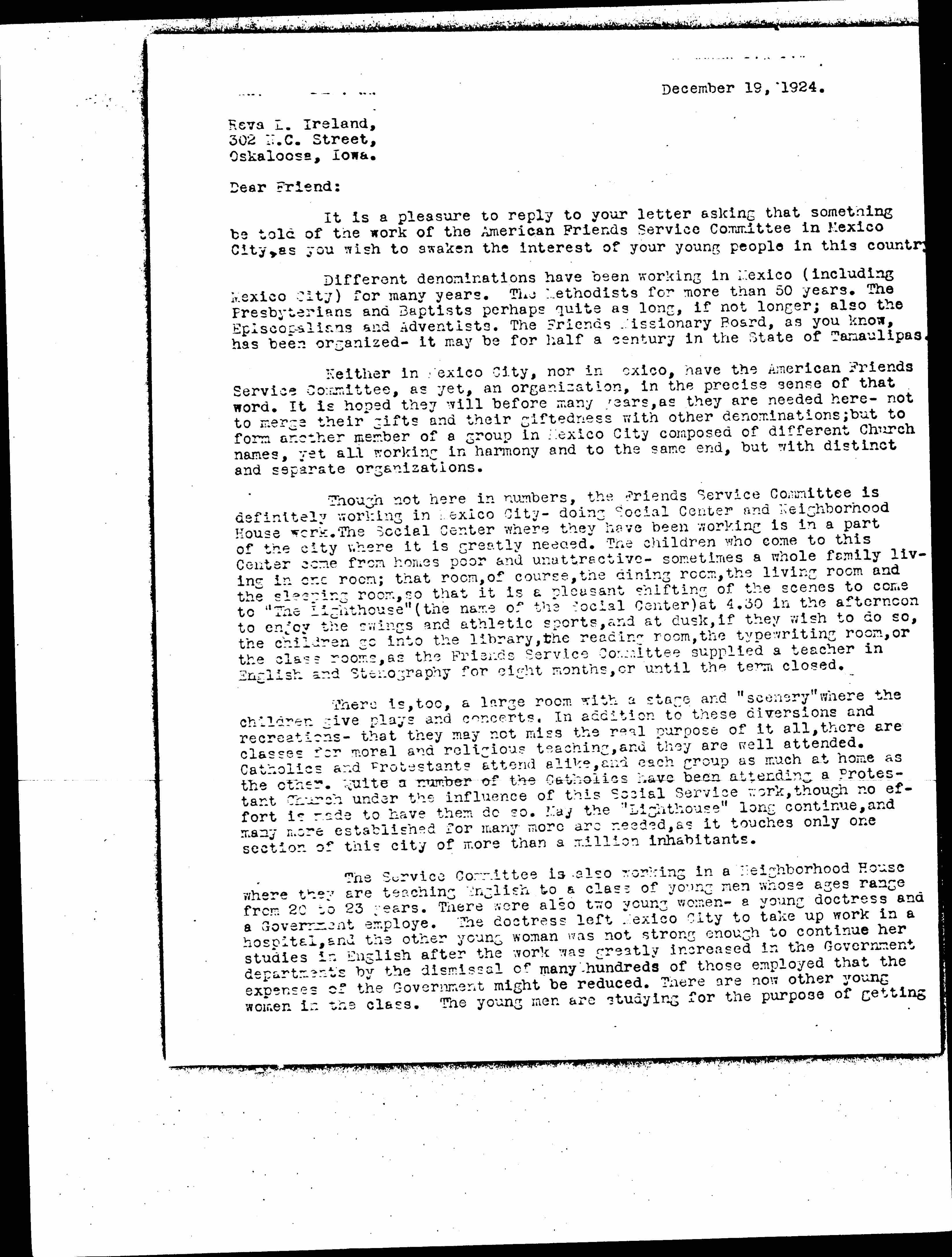 Though not here in numbers, the Friends Service Committee is definitely working in Mexico City -- doing Social Center and Neighborhood House work. The Social Center where they have been working is in a part of the city where it is greatly needed. The children who come to this Center come from homes poor and unattractive -- sometimes a whole family living in one room; that room, of course, the dining room, the living room and the sleeping room, so that it is a pleasant shifting of the scenes to come to "The Lighthouse" (the name of the Social Center) at 4:30 in the afternoon to enjoy the swings and athletic sports, and at dusk, if they wish to do so, the children go into the library, the reading room, the typewriting room, or the class rooms, as the Friends Service Committee supplied a teacher in English and Stenography for eight months, or until the term closed.