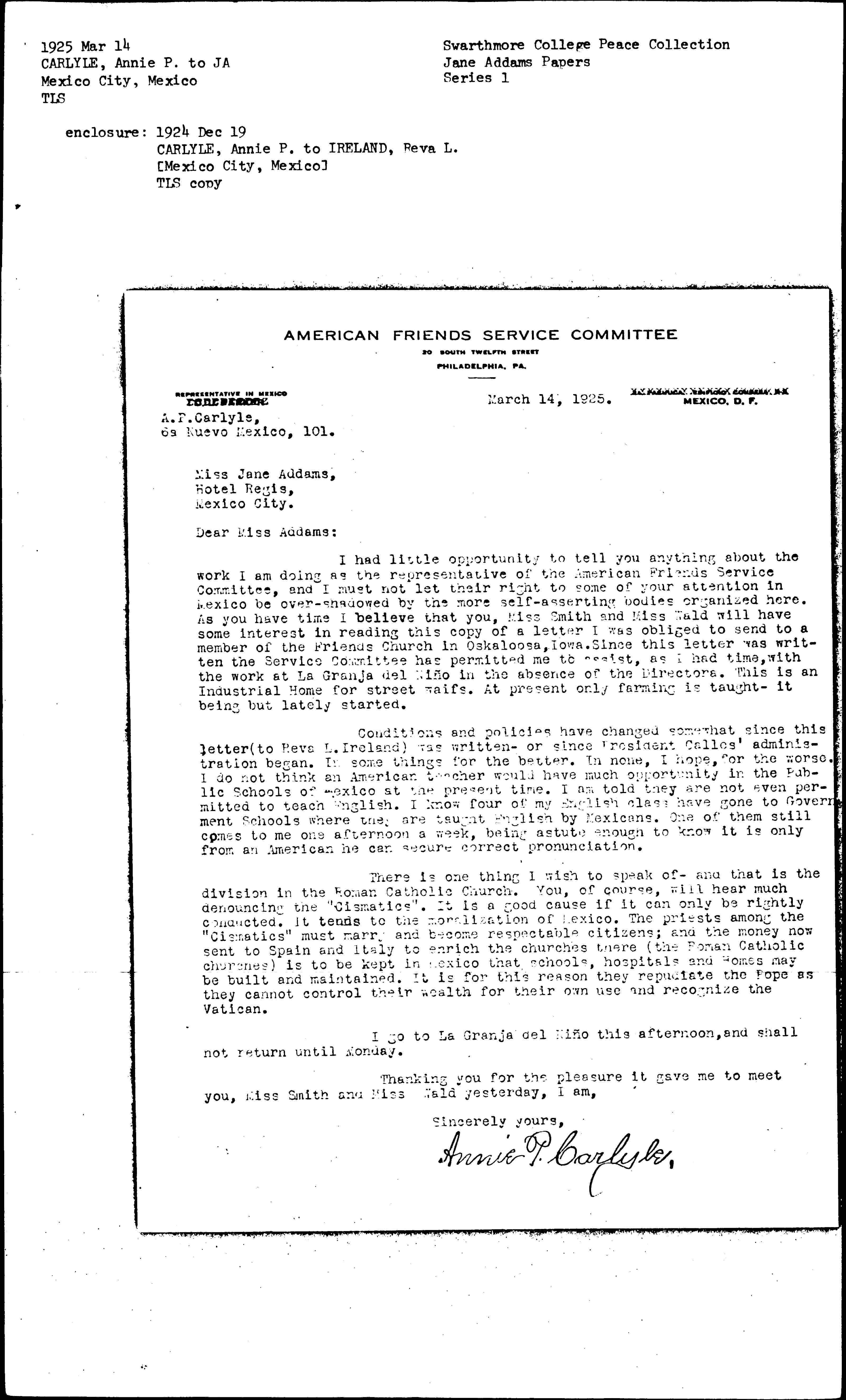 Neither in Mexico City, nor in [Mexico], have the American Friends Service Committee, as yet, an organization, in the precise sense of that word. It is hoped they will before many years, as they are needed here -- not to merge their gifts and their giftedness with other denominations; but to form another member of a group in Mexico City composed of different Church names, yet all working in harmony and to the same end, but with distinct and separate organizations.