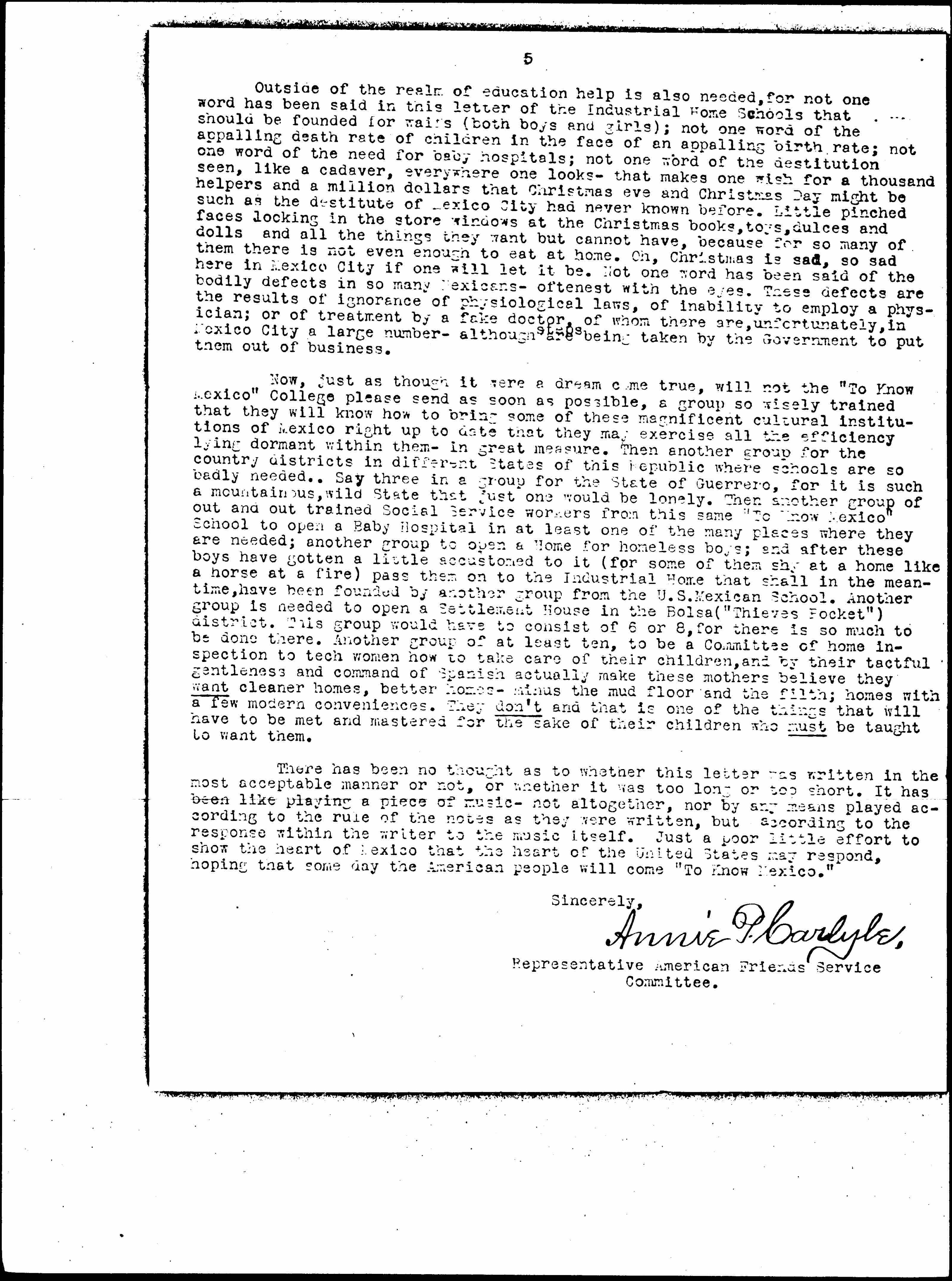 Now, just as though it were a dream come true, will not the "To Know Mexico" College please send as soon as possible, a group so wisely trained that they will know how to bring some of these magnificent cultural institutions of Mexico right up to date that they may exercise all the efficiency lying dormant within them -- in great measure. Then another group for the country districts in different States of this Republic where schools are so badly needed. Say three in a group for the State of Guerrero, for it is such a mountainous, wild State that just one would be lonely. Then another group of out and out trained Social Service workers from this same "To Know Mexico" School to open a Baby Hospital in at least one of the many places where they are needed; another group to open a Home for homeless boys; and after these boys have gotten a little accustomed to it (for some of them shy at a home like a horse at a fire) pass them on to the Industrial Home that shall in the meantime, have been founded by another group from the U.S. Mexican School. Another group is needed to open a Settlement House in the Bolsa ("Thieves Pocket") district. This group would have to consist of 6 or 8, for there is so much to be done there. Another group of at least ten, to be a Committee of home inspection to [teach] women how to take care of their children, and by their tactful gentleness and command of Spanish actually make these mothers believe they want cleaner homes, better homes -- minus the mud floor and the filth; homes with a few modern conveniences. They don't and that is one of the things that will have to be met and mastered for the sake of their children who must be taught to want them.
