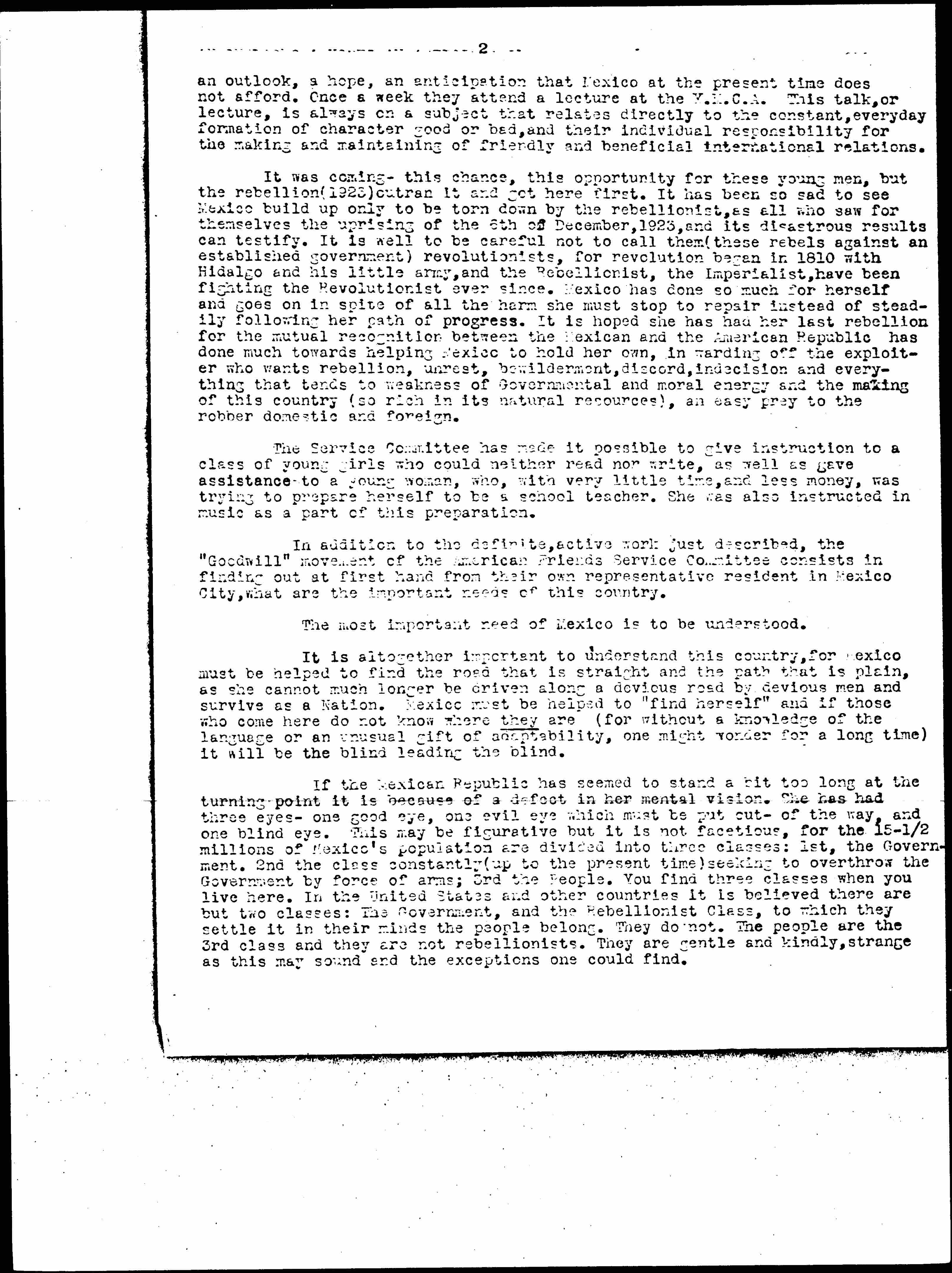 The Service Committee is also working in a Neighborhood House where they are teaching English to a class of young men whose ages range from 20 to 23 years. There were also two young women -- a young doctress and a Government [employee]. The doctress left Mexico City to take up work in a hospital, and the other young woman was not strong enough to continue her studies in English after the work was greatly increased in the Government departments by the dismissal of many hundreds of those employed that the expenses of the Government might be reduced. There are now other young women in the class. The young men are studying for the purpose of getting [page 2] an outlook, a hope, an anticipation that Mexico at the present time does not afford. Once a week they attend a lecture at the Y.M.C.A. This talk, or lecture, is always on a subject that relates directly to the constant, everyday formation of character good or bad, and their individual responsibility for the making and maintaining of friendly and beneficial international relations.