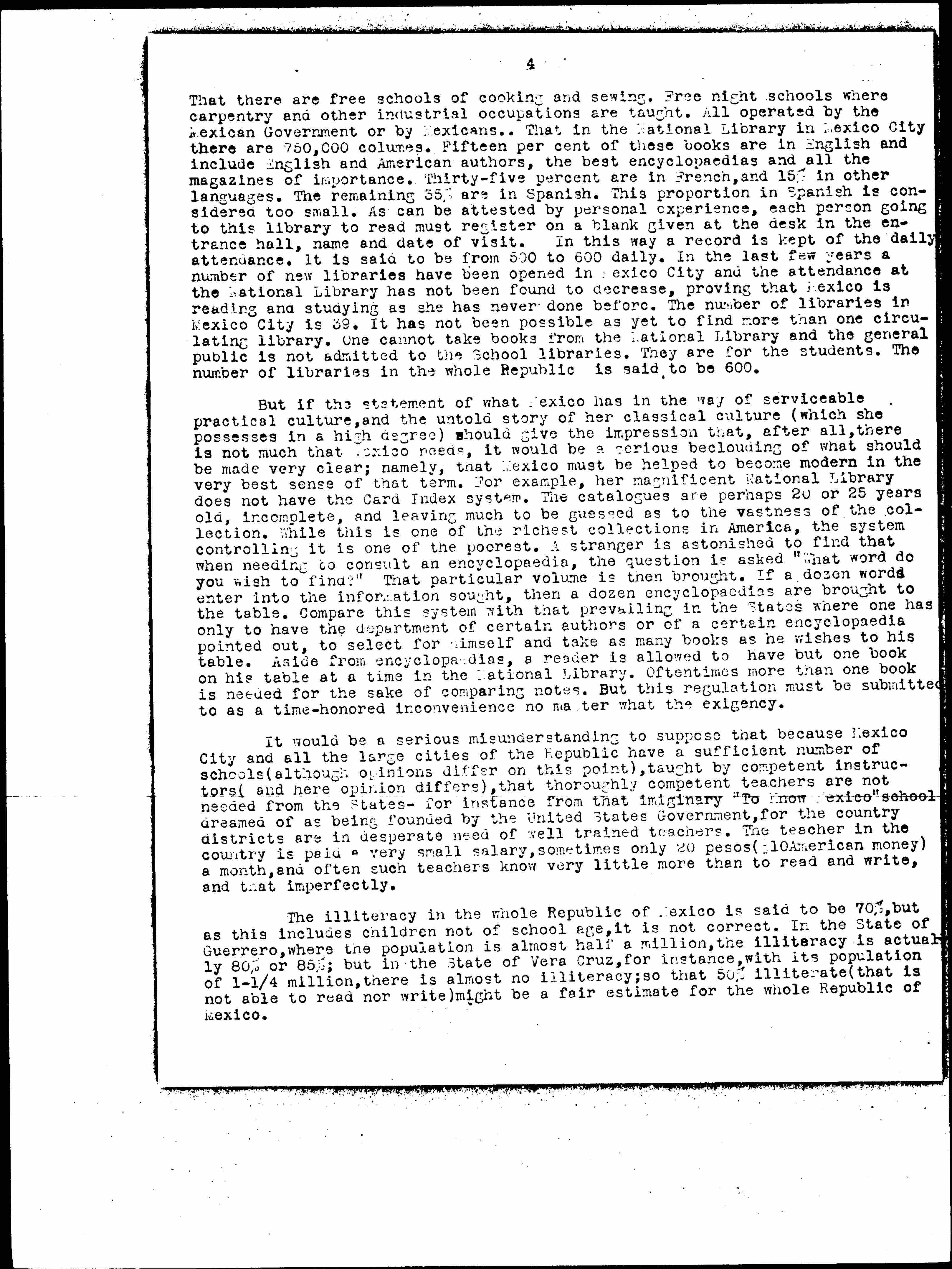 The United States has been friendly to Mexico. Suppose it were to put real warmth and whole-heartedness into that friendship and do the thing that is unbusiness-like, unconventional perhaps, even unheard of -- for after all it is our great United States of America that must take the lead in putting some divinity into National measures. Cannot depend on England for that when one thinks of South Africa and now Egypt. Imagine what could be accomplished if the United States should found and endow a school for the sole purpose of training educators for Mexico and maintain each one for a pledged three-years service in Mexico. Admit no one who, on examination, could not show a sincere desire and adaptability for the work. The course to embrace a thorough study of the history of Mexico, past, present and its prospects for the future. A thorough course in the Spanish language so that it could be spoken and readily understood when spoken by others. A study of the disposition of the Mexicans -- that it may be known that they really do understand justice and kind treatment. The whole curriculum could be summed up in three words: "To Know Mexico." There is no idealization of the Mexicans in all this. Far from it. One cannot live here for more than a year and idealize them; but in that time one comes to find out what it is they need to have done for them to help them in some measure to approach the ideal. The course might well include a study of Mexican institutions that the egotistical or facetious disposition toward this country may not develop; that the student may know before he comes here that Mexico has perhaps more schools in proportion to the population than New York City. That every High School has a library and a Museum. [page 4] That there are free schools of cooking and sewing. Free night schools where carpentry and other industrial occupations are taught. All operated by the Mexican Government or by Mexicans. That in the National Library in Mexico City there are 750,000 volumes. Fifteen [percent] of these books are in English and include English and American authors, the best [encyclopedias] and all the magazines of importance. Thirty-five percent are in French, and 15% in other languages. The remaining 35% are in Spanish. This proportion in Spanish is considered too small. As can be attested by personal experience, each person going to this library to read must register on a blank given at the desk in the entrance hall, name and date of visit. In this way a record is kept of the daily attendance. It is said to be from 500 to 600 daily. In the last few years a number of new libraries have been opened in Mexico City and the attendance at the National Library has not been found to decrease, proving that Mexico is reading and studying as she has never done before. The number of libraries in Mexico City is 39. It has not been possible as yet to find more than one circulating library. One cannot take books from the National Library and the general public is not admitted to the School libraries. They are for the students. The number of libraries in the whole Republic is said to be 600.
