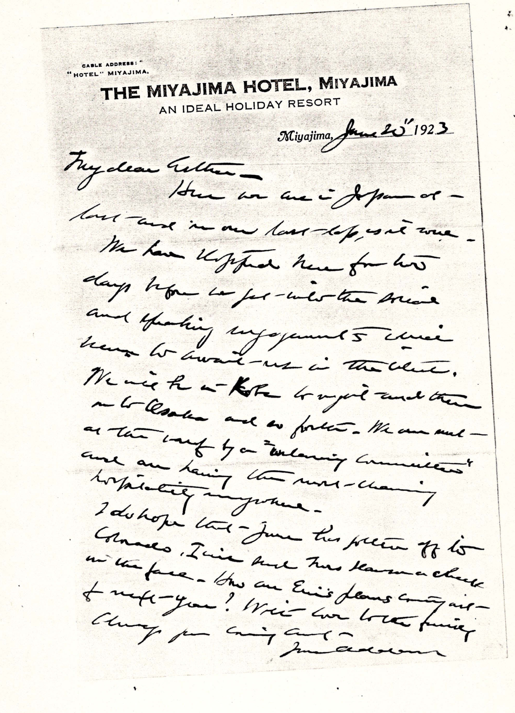 We have stopped here for two days before we get into the social and speaking arrangements which [seem] to await us in the cities. We will be in Kobe tonight and then on to Osaka and so forth. We were met at the [wharf] by a "welcoming committee" and are having the most charming hospitality everywhere.