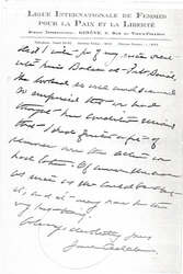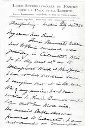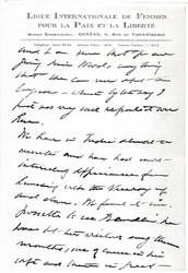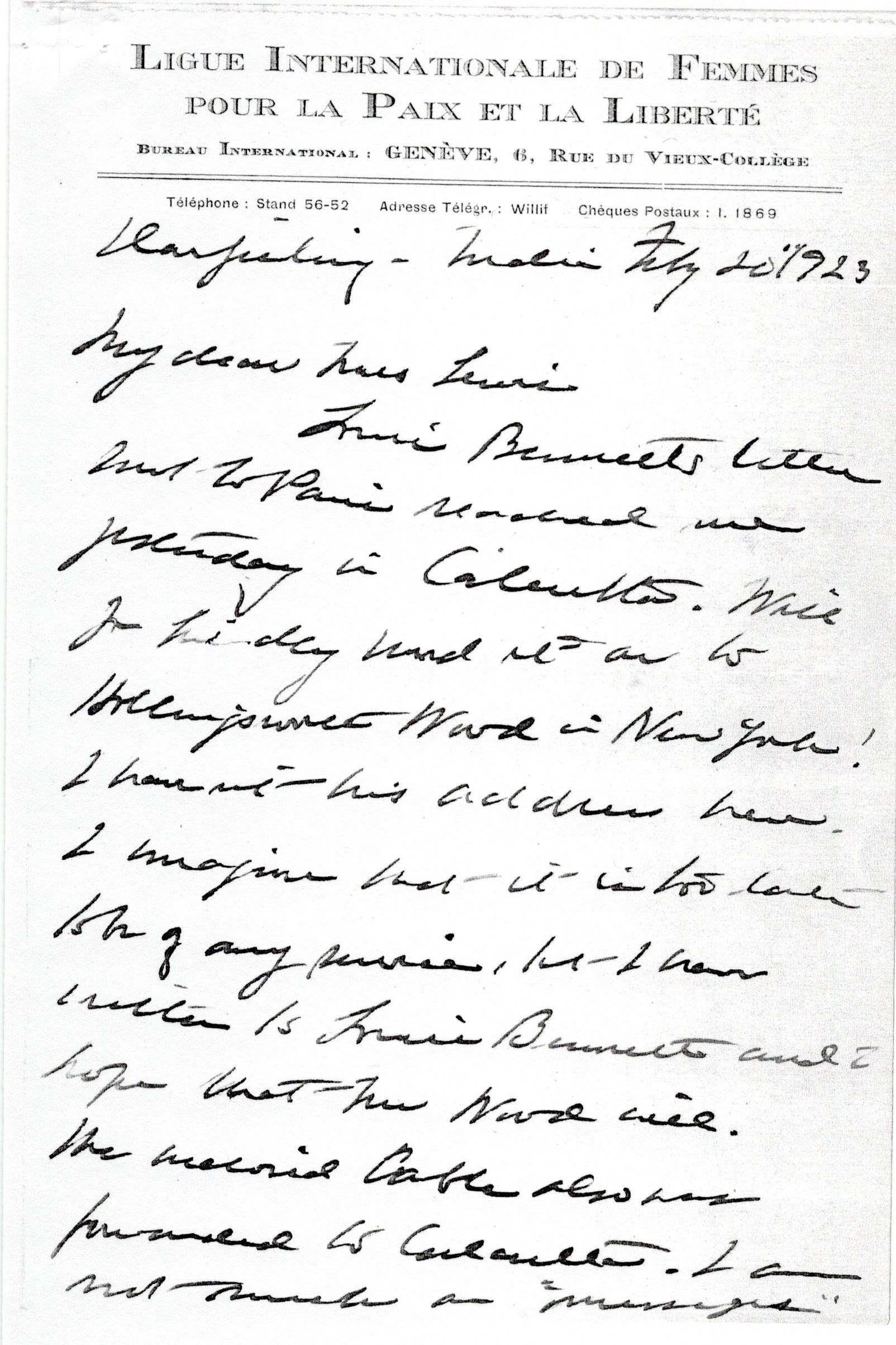 Louie Bennetts letter sent to Paris reached me yesterday in Calcutta. Will you kindly send it on to Hollingsworth Wood in New York? I haven't his address here. I imagine that it is too late to be of any service, but I have written to Louie Bennett and I hope that Mr Wood will. The [enclosed] cable also was forwarded to Calcutta. I am not much on "messages" [page 2] and I am sure that you are giving Miss Woods anything that she can use about the Congress -- which by the way I find was very well reported over here.