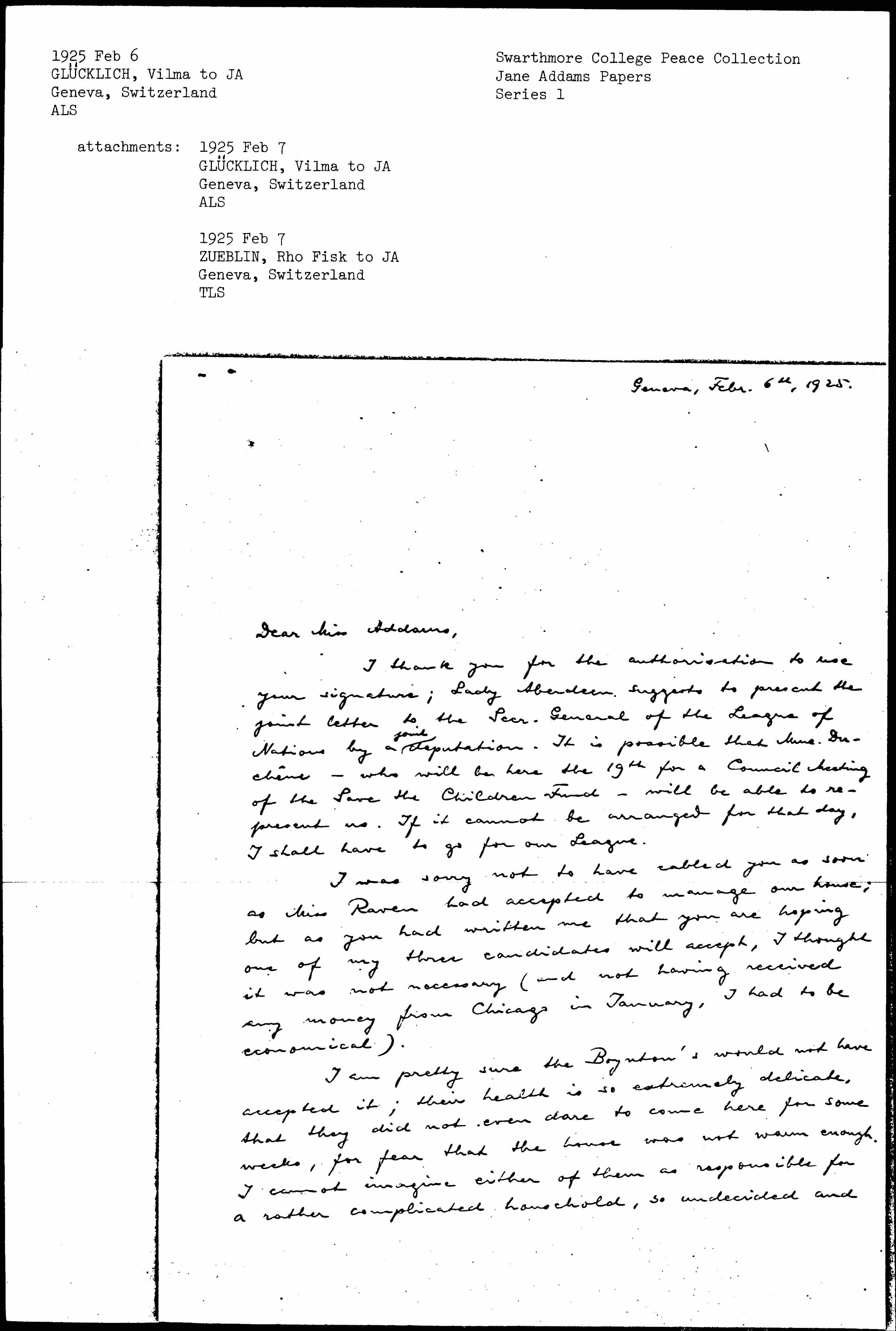 I thank you for the authorization to use your signature; Lady Aberdeen suggests to present the joint letter to the Secr. General of the League of Nations by a ↑joint↓ deputation. It is possible that Mme. Duchêne -- who will be here the 19th for a Council Meeting of the Save the Children Fund -- will be able to represent us. If it cannot be arranged for that day, I shall have to go for our League.