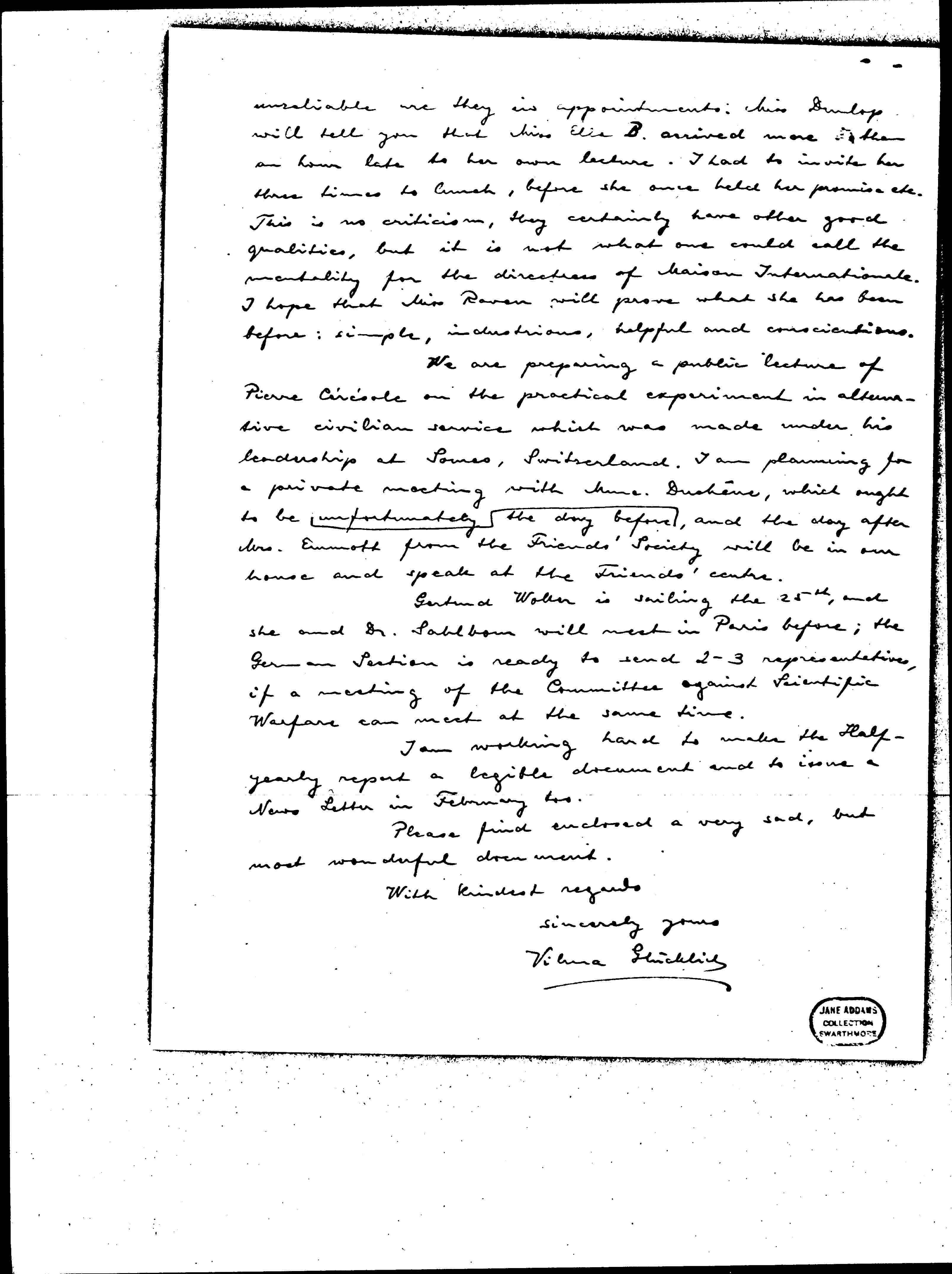 We are preparing a public lecture of Pierre Cérésole on the practical experiment in alternative civilian service which was made under his leadership at [Sorens?] Switzerland. I am planning for a private meeting with Mme. Duchêne, which ought to be the day before unfortunately, and the day after Mrs. Emmott from the Friends' Society will be in our house and speak at the Friends' [center].
