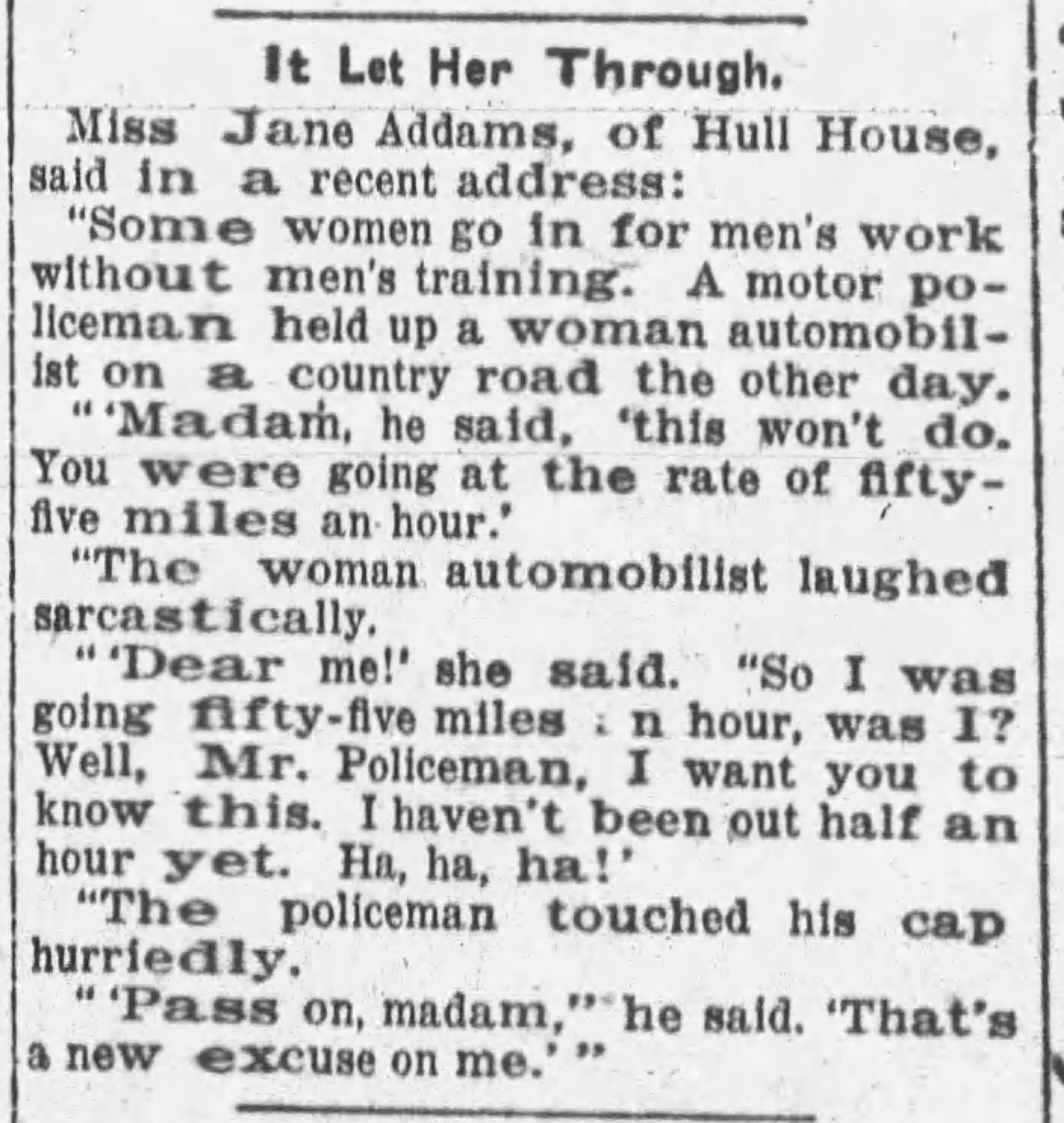 "'Madam,' he said, 'this won't do. You were going fifty-five miles an hour.'