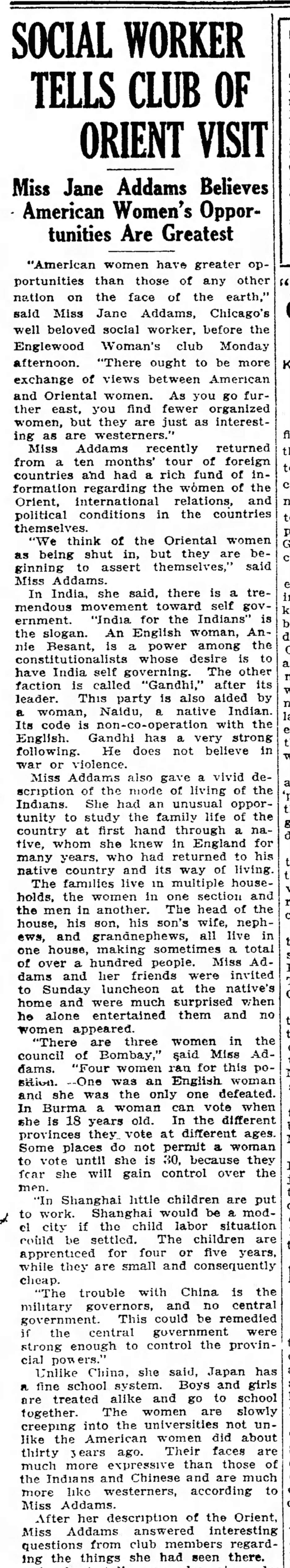"There are three women in the council of Bombay," said Miss Addams. "Four women ran for this position. One was an English woman and she was the only one defeated. In Burma a woman can vote when she is 18 years old. In the different provinces they vote at different ages. Some places do not permit a woman to vote until she is 30, because they fear she will gain control over the men.