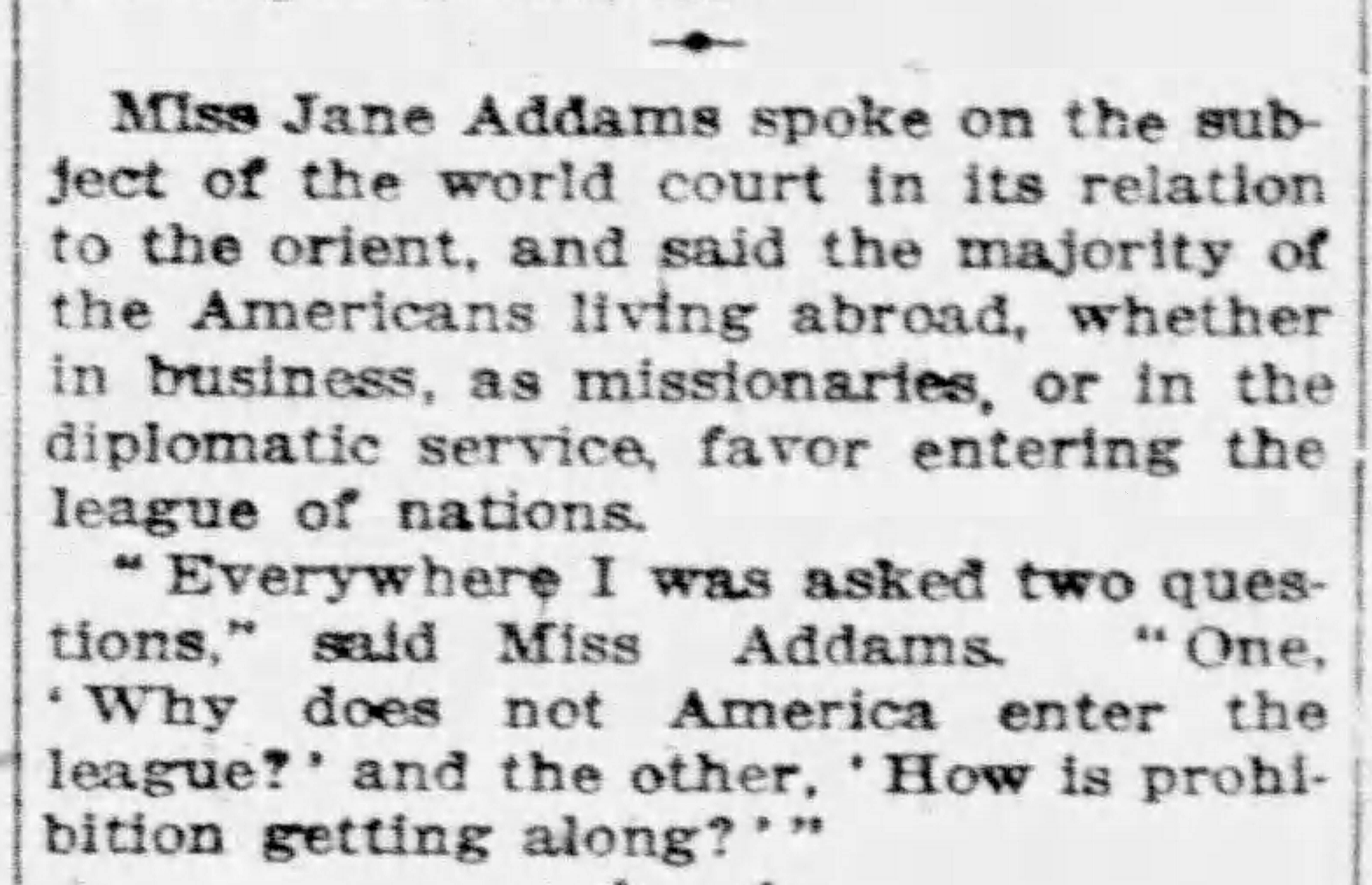 "Everywhere I was asked two questions," said Miss Addams. "One, 'Why does not America enter the league?' and the other, 'How is prohibition getting along?'"