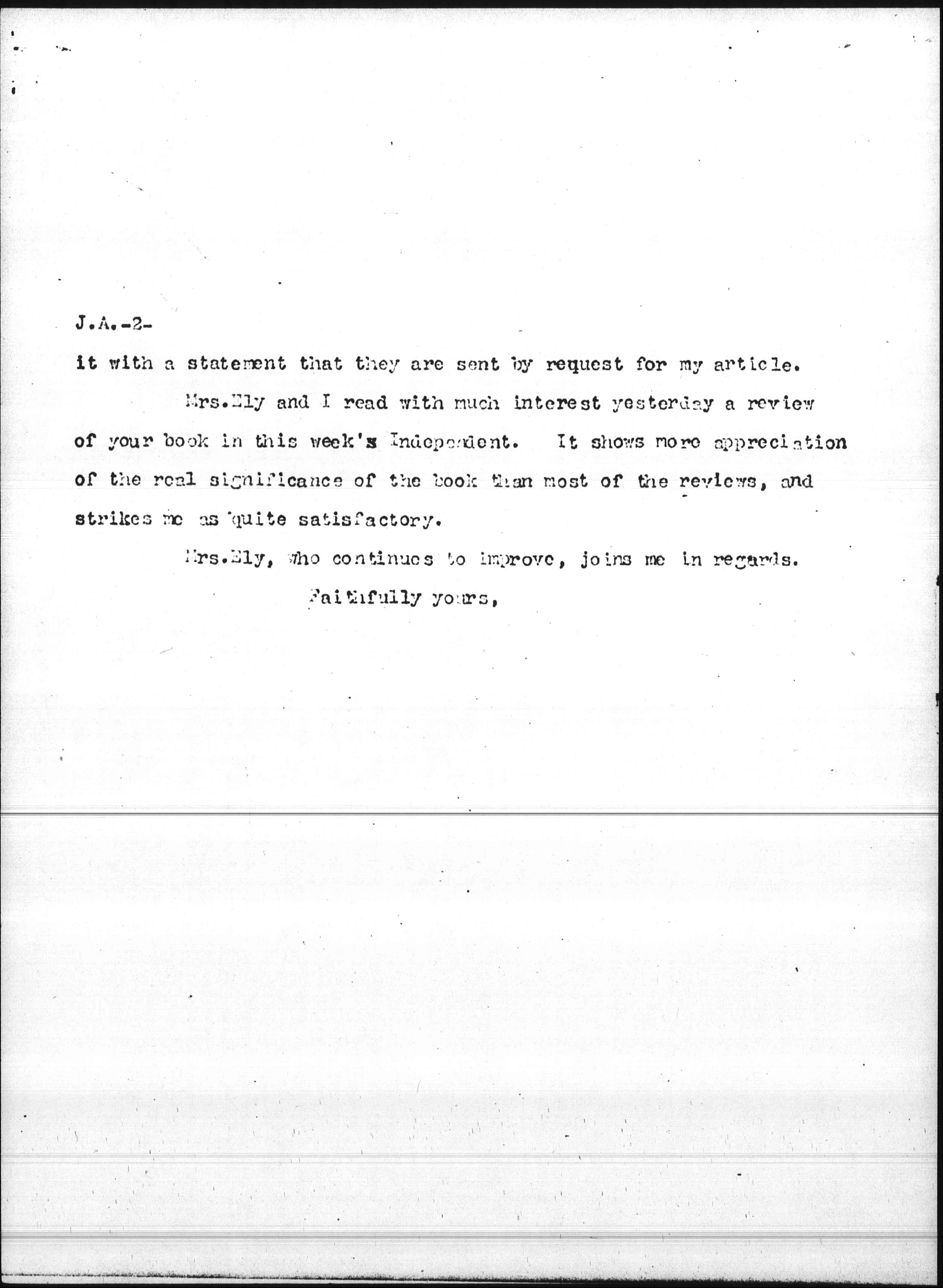 Mrs. Ely and I read with much interest yesterday a review of your book in this week's Independent. It shows more appreciation of the real significance of the book than most of the reviews, and strikes me as quite satisfactory.