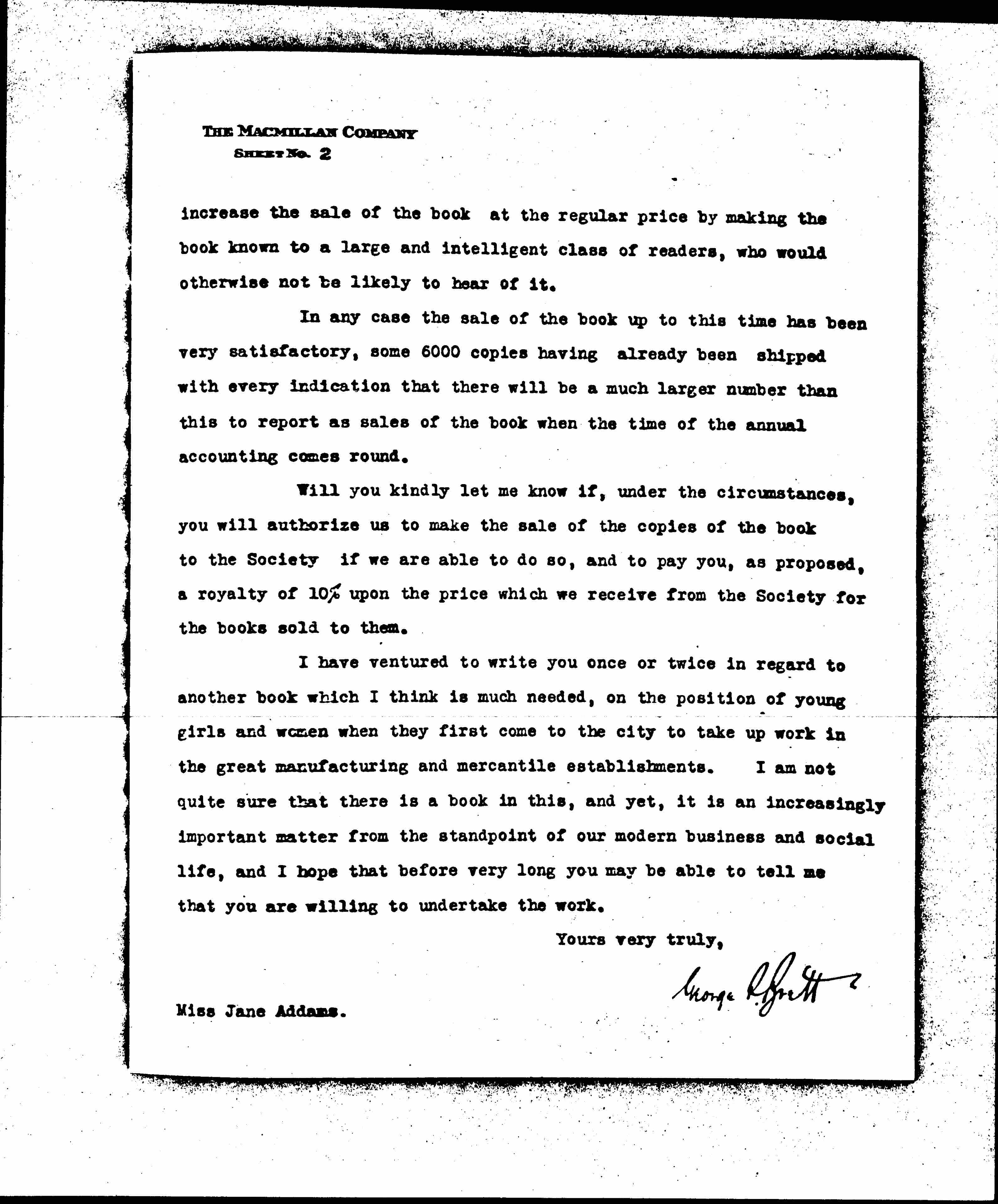 Will you kindly let me know if, under the circumstances, you will authorize us to make the sale of the copies of the book to the Society if we are able to do so, and to pay you, as proposed, a royalty of 10% upon the price which we receive from the Society for the books sold to them.