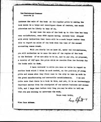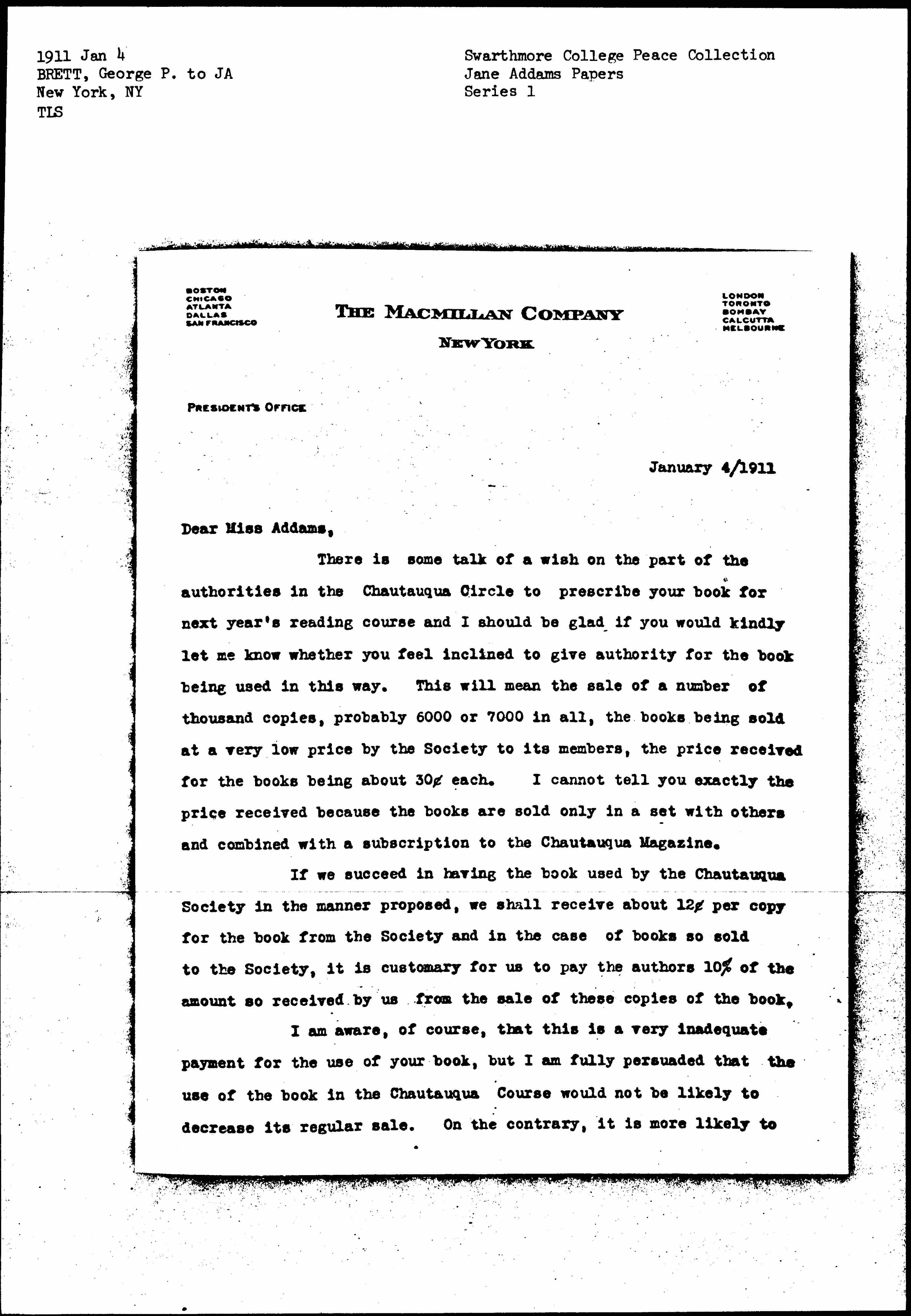 If we succeed in having the book used by the Chautauqua Society in the manner proposed, we shall receive about 12 [cents] per copy for the book from the Society and in the case of books so sold to the Society, it is customary for us to pay the authors 10% of the amount so received by us from the sale of these copies of the book.