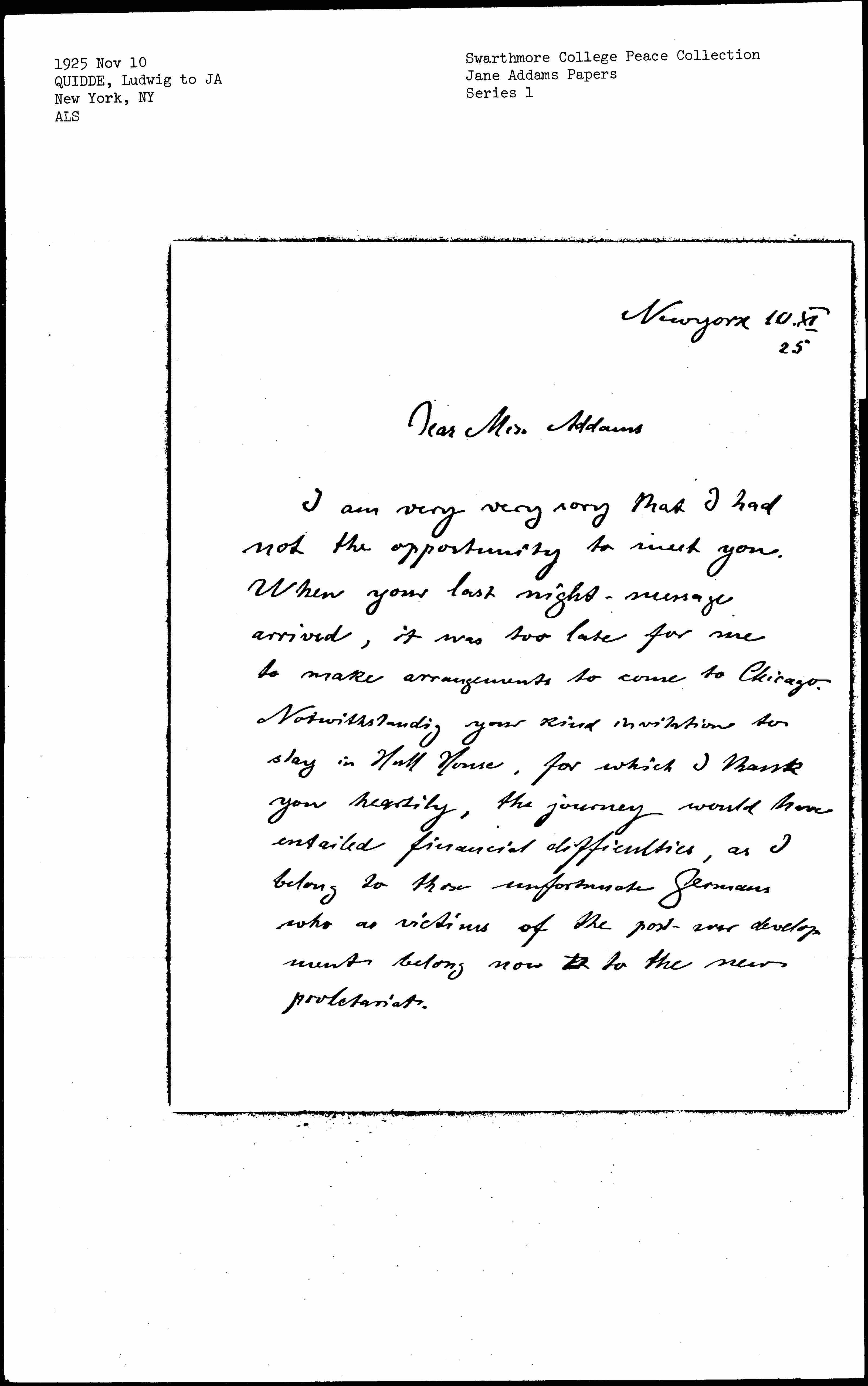 I am very very sorry that I had not the opportunity to meet you. When your last night message arrived, it was too late for me to make arrangements to come to Chicago. Notwithstanding your kind invitation to stay in Hull House, for which I thank you heartily, the journey would have entailed financial difficulties, as I belong to those unfortunate Germans who as victims of the post-war development belong now to to the new proletariat. [page 2]