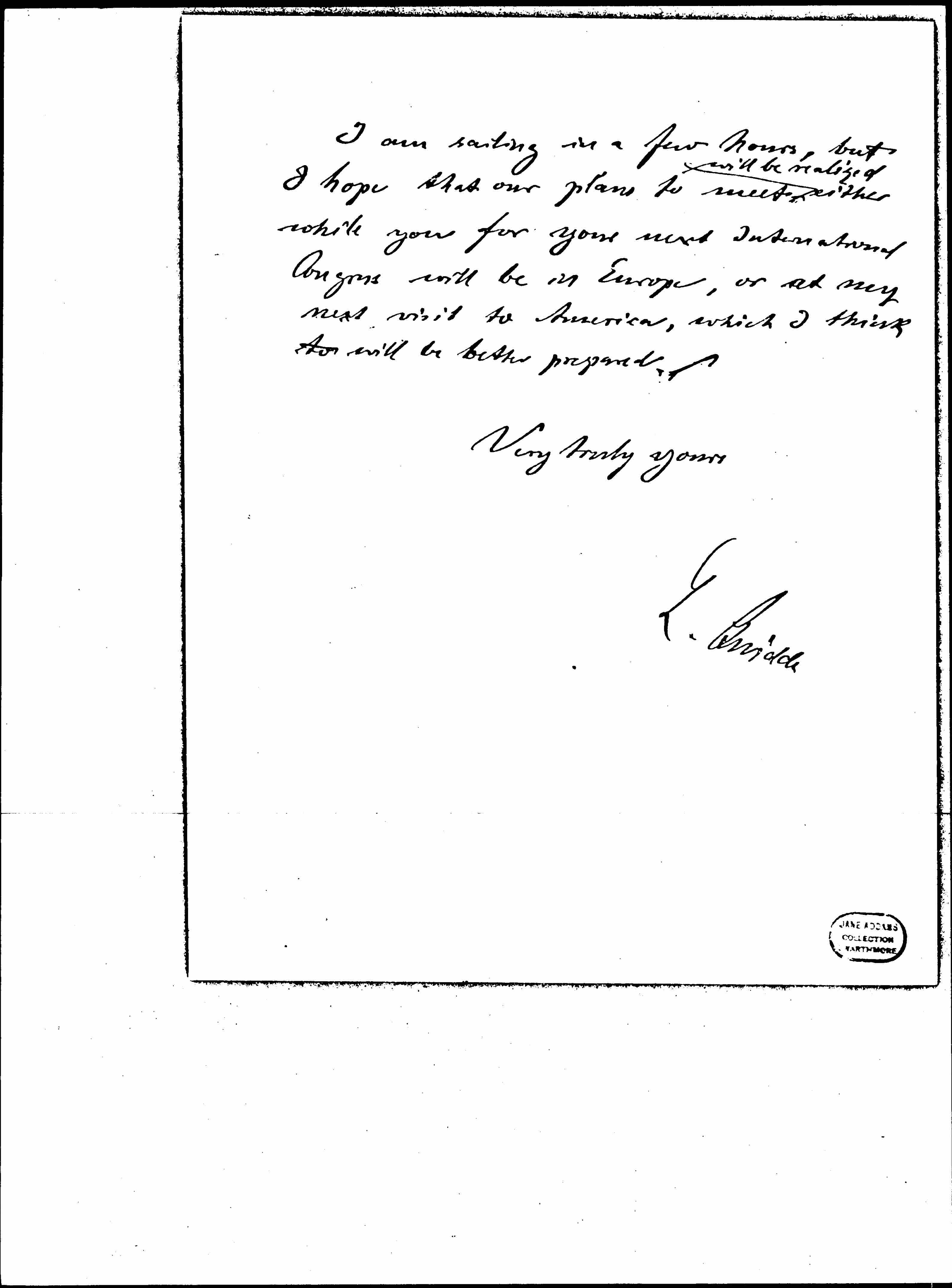 I am sailing in a few hours, but I hope that our plans to meet ↑will be realized↓ either while you for your next International Congress will be in Europe, or at my next visit to America, which I think to will be better prepared.