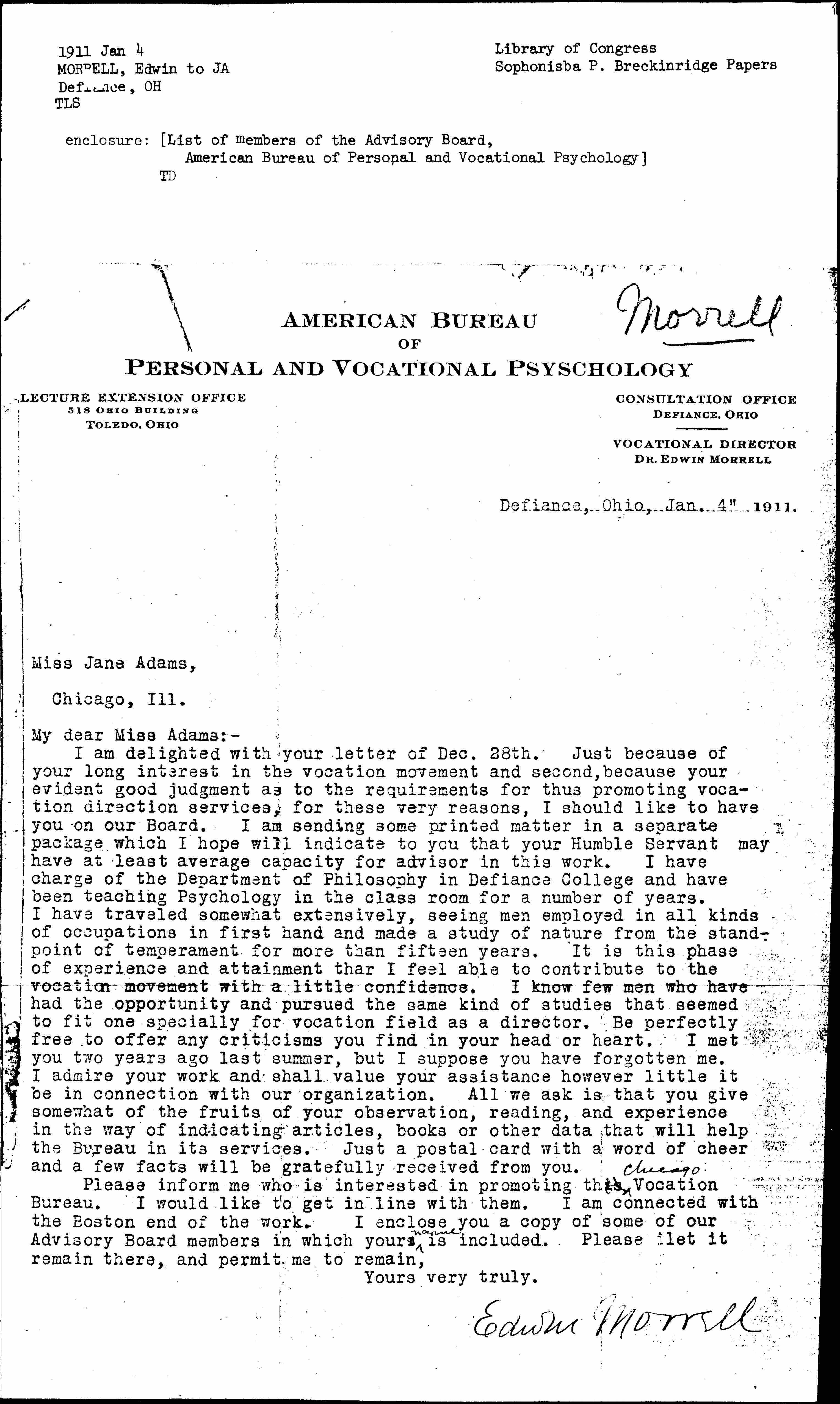 I am delighted with your letter of Dec. 28th. Just because of your long interest in the vocation movement and second, because your evident good judgement as to the requirements for thus promoting vocation direction services, for these very reasons, I should like to have you on our Board. I am sending some printed matter in a separate package which I hope will indicate to you that your Humble Servant may have at least average capacity for advisor in this work. I have charge of the Department of Philosophy in Defiance College and have been teaching Psychology in the class room for a number of years. I have traveled somewhat extensively, seeing men employed in all kinds of occupations in first hand and made a study of nature from the standpoint of temperament for more than fifteen years. It is this phase of experience and attainment that I feel able to contribute to the vocation movement with a little confidence. I know few men who have had the opportunity and pursued the same kind of studies that seemed to fit one specifically for vocation field as a director. Be perfectly free to offer any criticisms you find in your head or heart. I met you two years ago last summer, but I suppose you have forgotten me. I admire your work and shall value your assistance however little it be in connection with our organization. All we ask is that you give somewhat of the fruits of your observation, reading, and experience in the way of indicating articles, books or other data that will help the Bureau in its services. Just a postal card with a word of cheer and a few facts will be gratefully received from you.