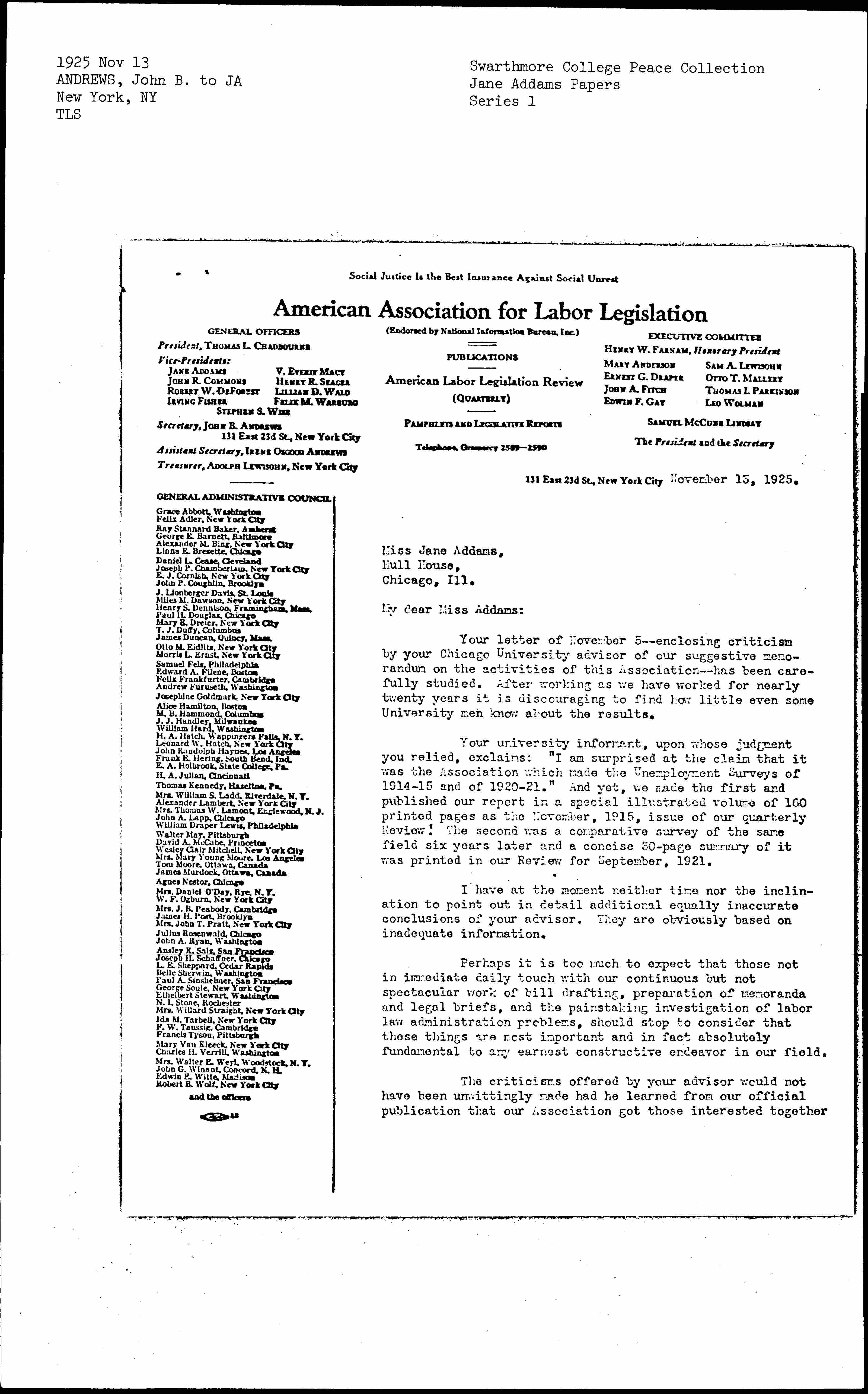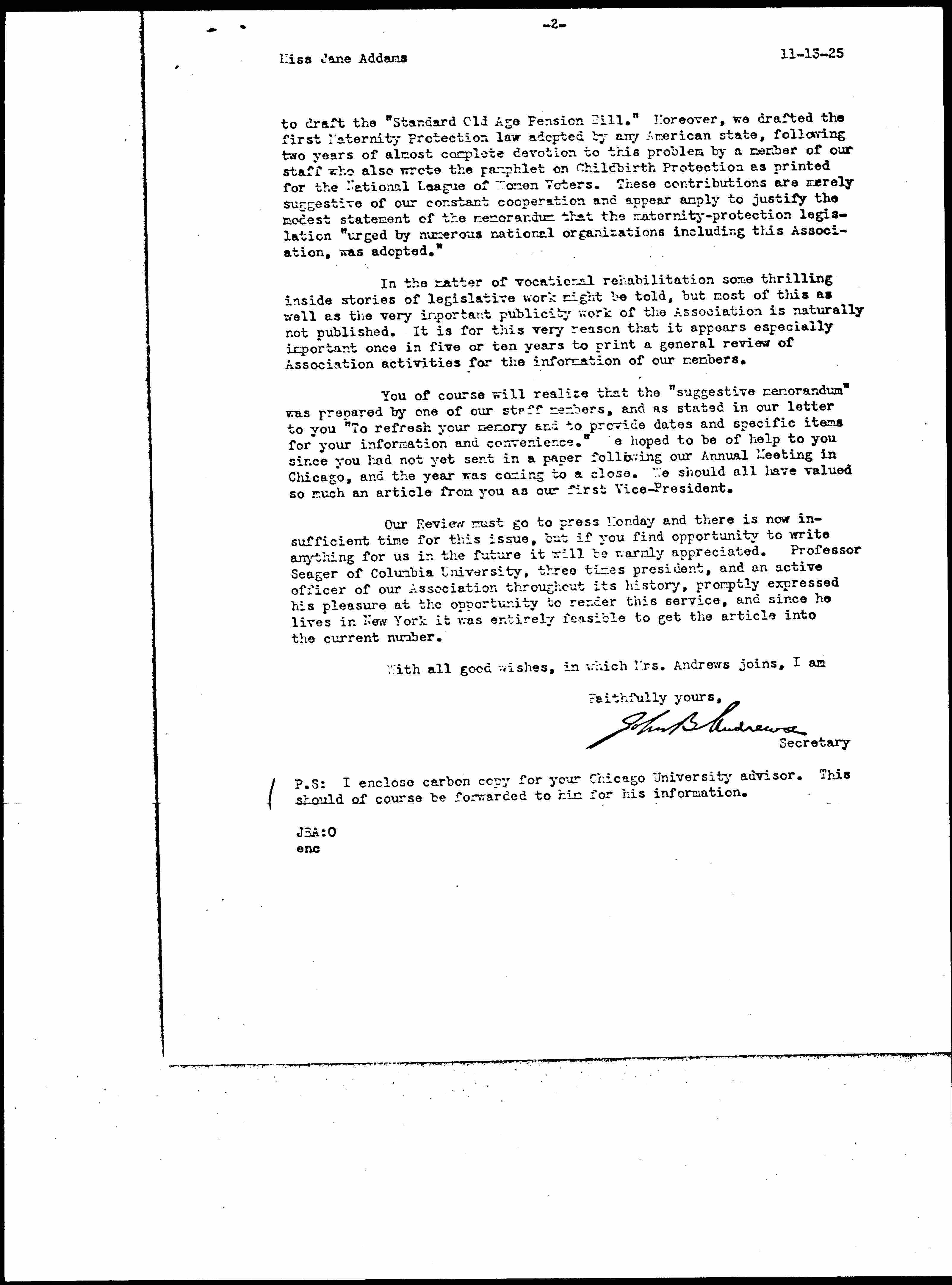 The criticisms offered by your advisor would not have been unwittingly made had he learned from our official publication that our Association got those interested together [page 2] to draft the "Standard Old Age Pension Bill." Moreover, we drafted the first Maternity Protection law adopted by any American state, following two years of almost complete devotion to this problem by a member of our staff who also wrote the pamphlet on Childbirth Protection as printed for the National League of Women Voters. These contributions are merely suggestive of our constant cooperation and appear amply to justify the modest statement of the memorandum that the maternity protection legislation "urged by numerous national organizations including this Association, was adopted."