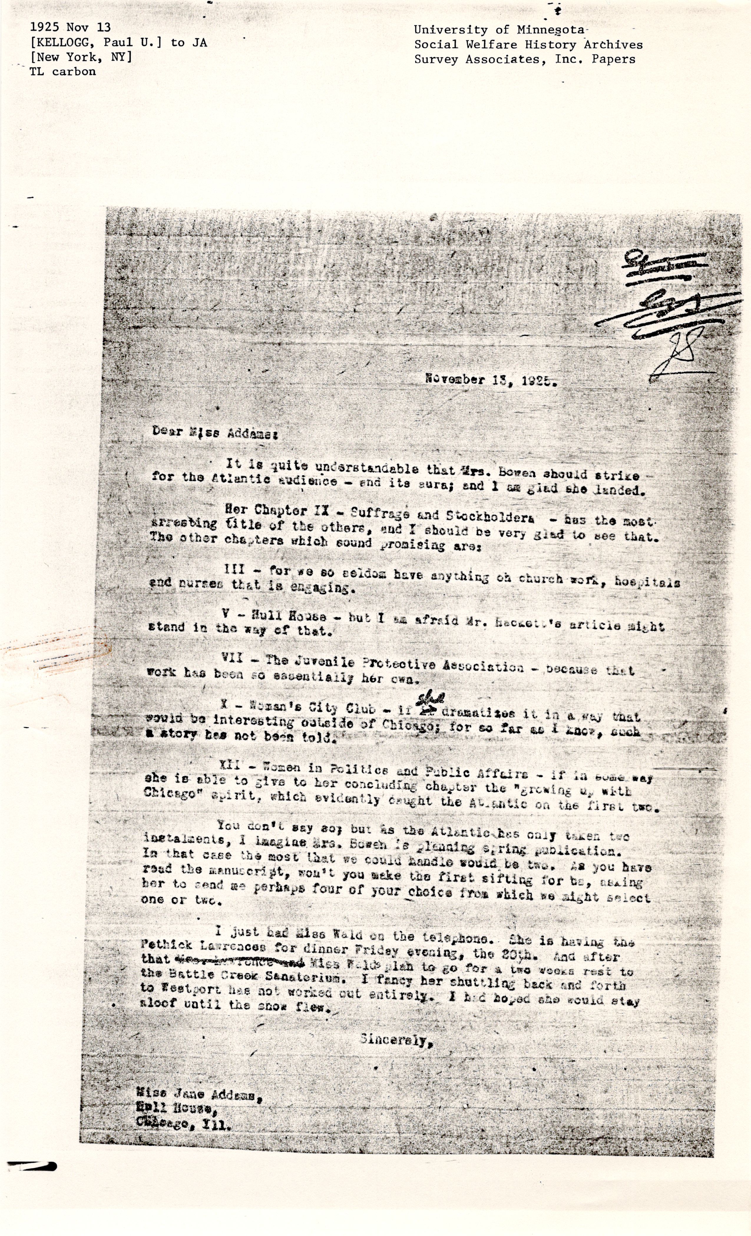I just had Miss Wald on the telephone. She is having the Pethick Lawrences for dinner Friday evening, the 20th. And after that Mrs. Lawrence and Miss Wald's plan to go for a two weeks rest to the Battle Creek Sanatorium. I fancy her shuttling back and forth to Westport has not worked out entirely. I had hoped she would stay aloof until snow flew.