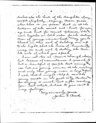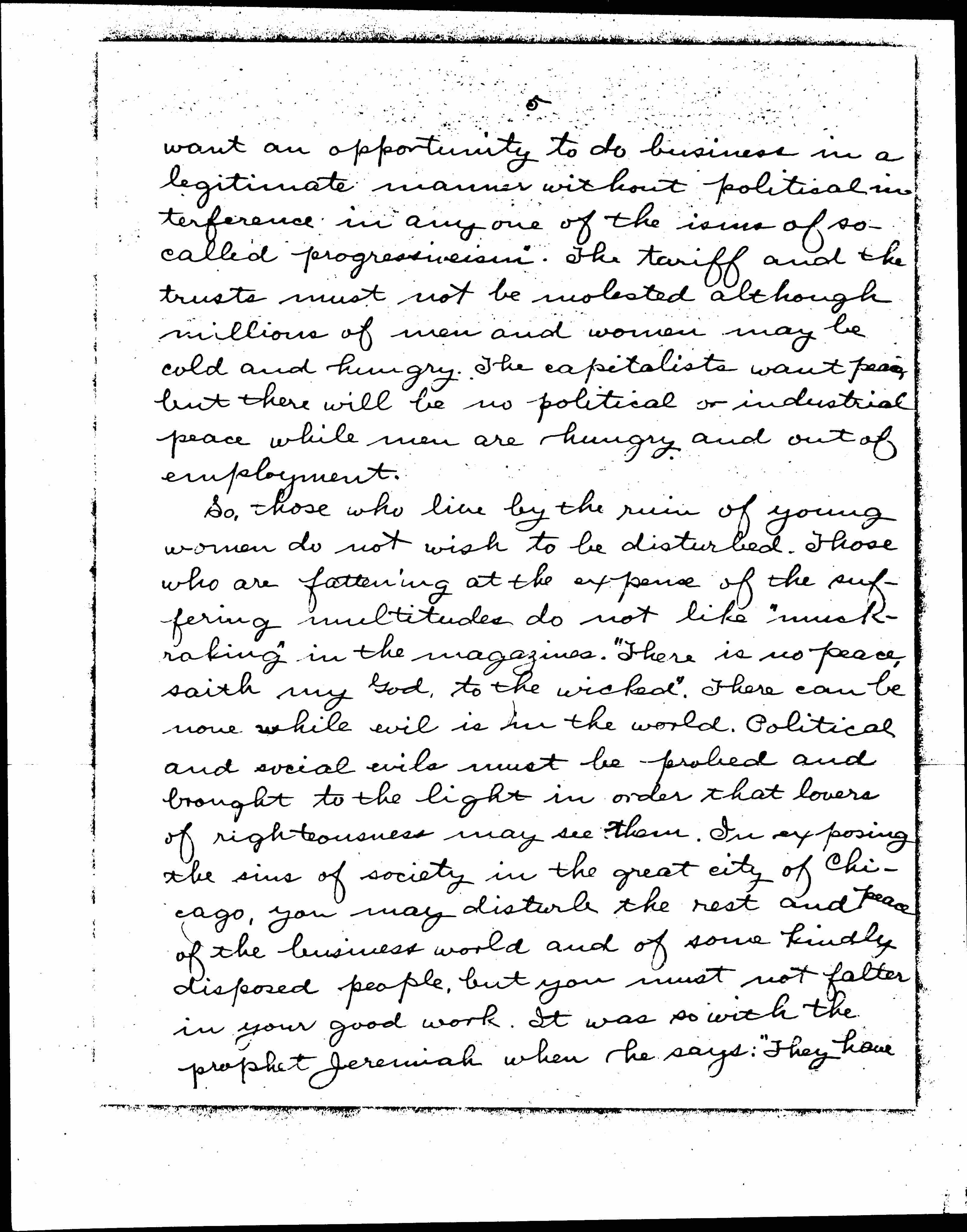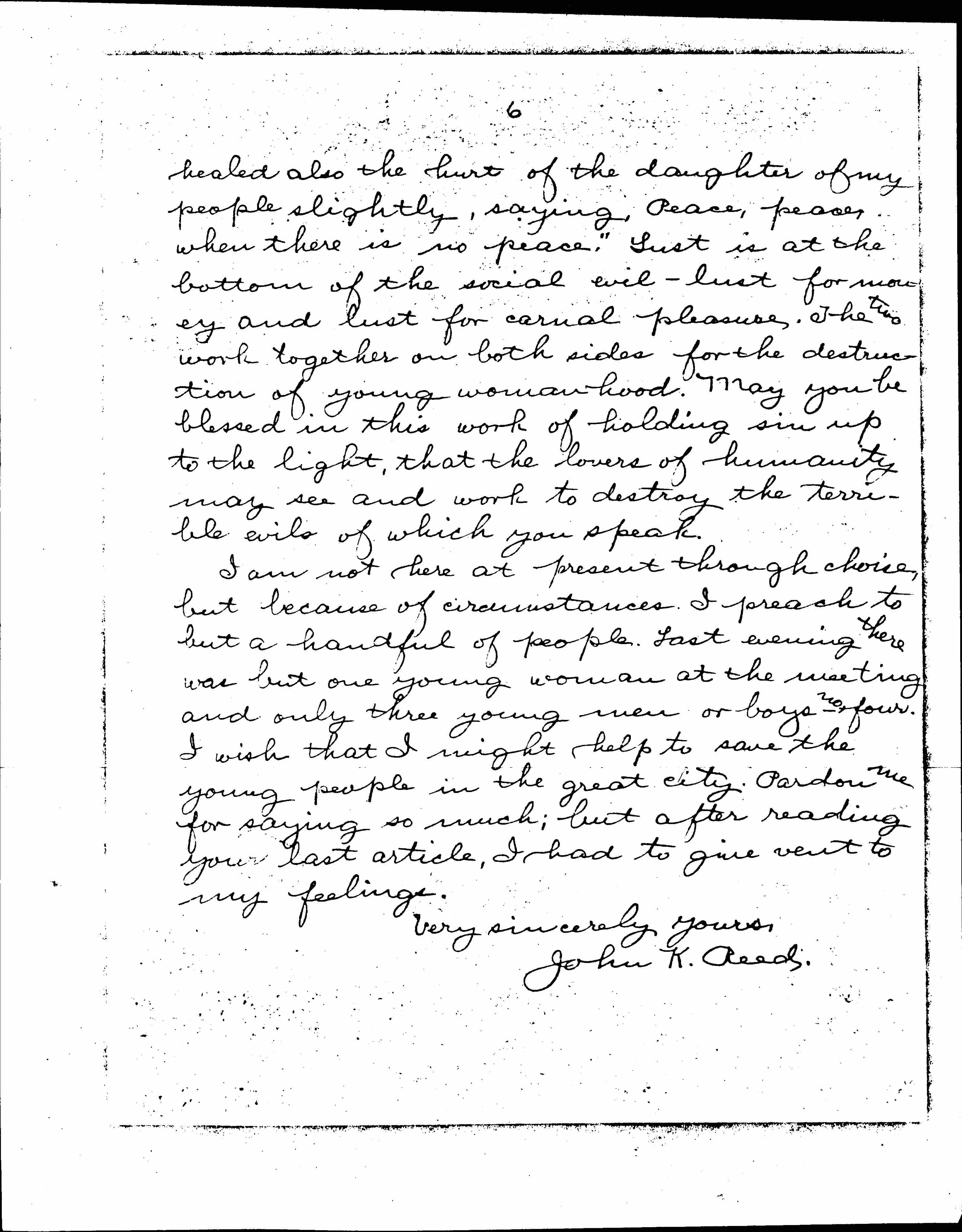 So, those who live by the ruin of young women do not wish to be disturbed. Those who are fattening at the expense of the suffering multitudes do not like "muckraking" in the magazines. "There is no peace, saith my God, to the wicked". There can be none while evil is in the world. Political and social evils must be probed and brought to the light in order that lovers of righteousness may see them. In exposing the sins of society in the great city of Chicago, you may disturb the rest and peace of the business world and of some kindly disposed people, but you must not falter in your good work. It was so with the prophet Jeremiah when he says: "They have [page 6] healed also the hurt of the daughter of my people slightly, saying, Peace, peace, when there is no peace". Lust is at the bottom of the social evil -- lust for money and lust for carnal pleasure. The two work together on both sides for the destruction of young woman hood. May you be blessed in this work of holding sin up to the light, that the lovers of humanity may see and work to destroy the terrible evils of which you speak.