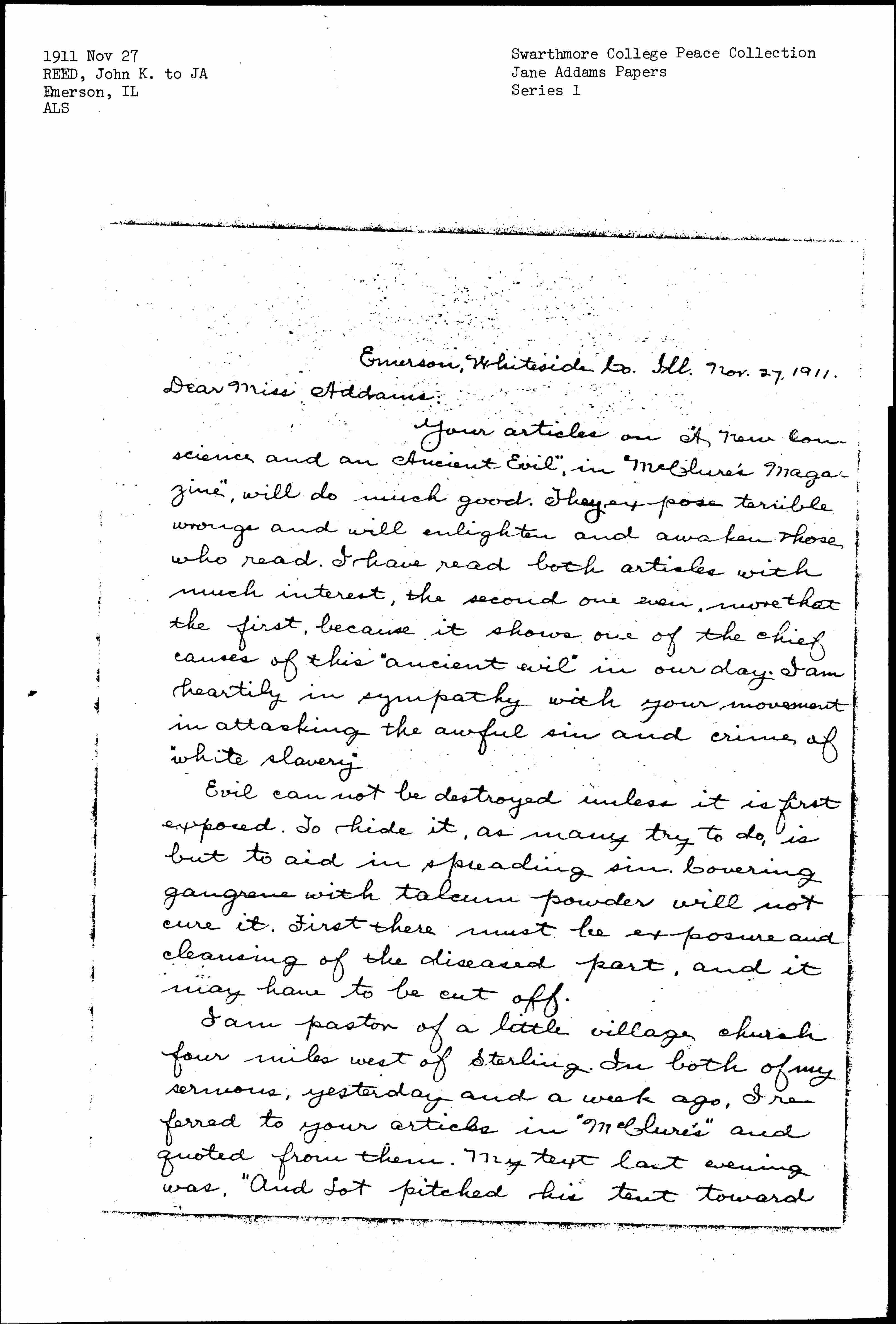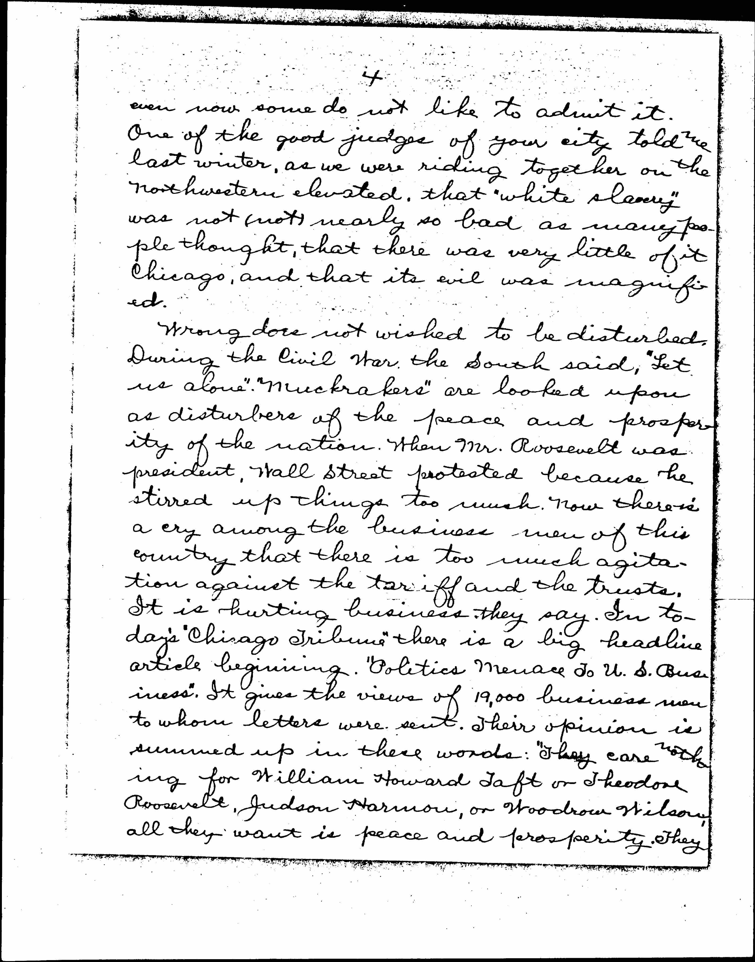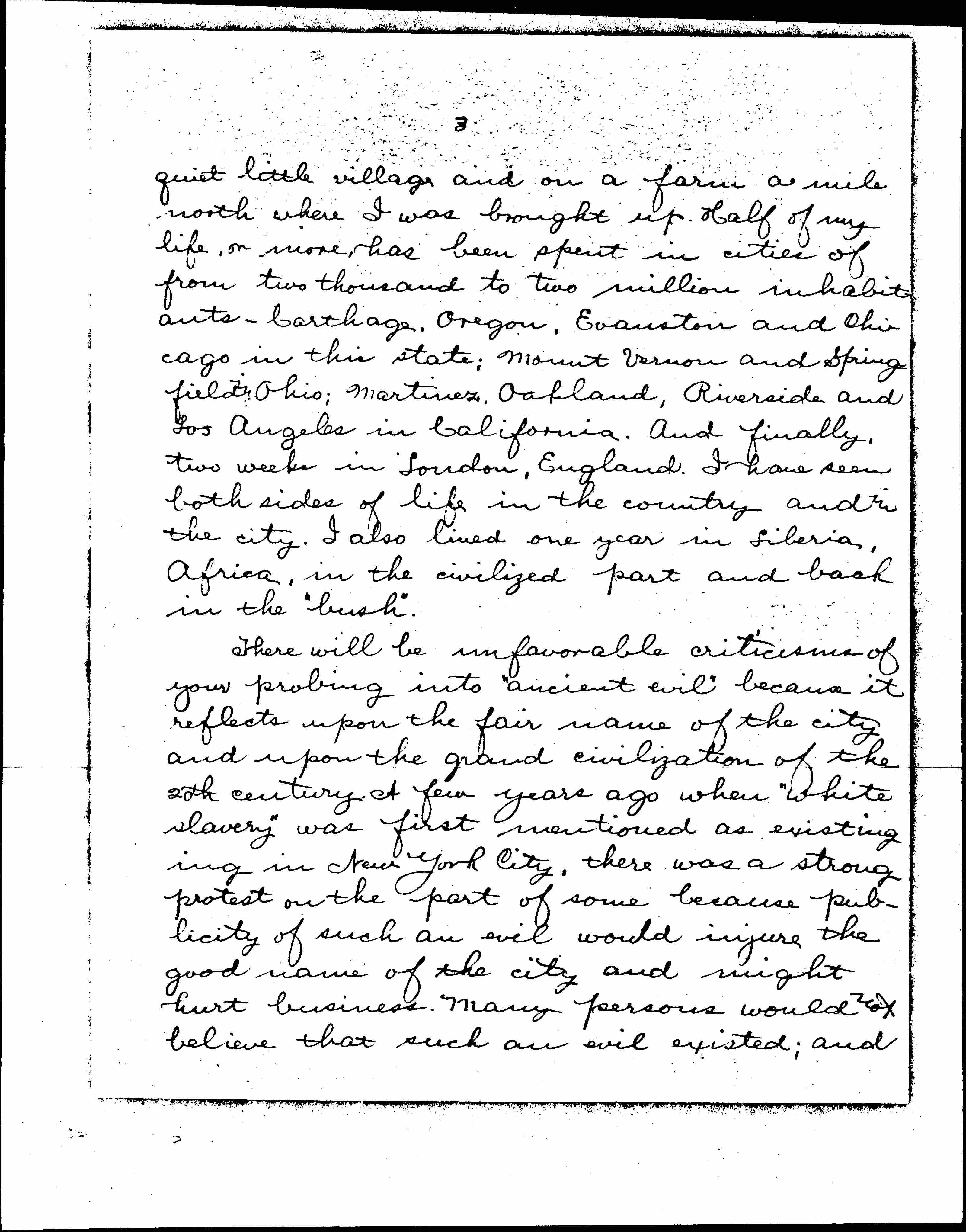 There will be unfavorable criticisms of your probing into "ancient evil" because it reflects upon the fair name of the city and upon the grandcivilization of the 20th century. A few years ago when "white slavery" was first mentioned as existing in New York City, there was a strong protest on the part of some because publicity of such an evil would injure the good name of the city and might hurt business. Many persons would not believe that such an evil existed; and [page 4] even now some do not like to admit it. One of the good judges of your city told me last winter, as we were riding together on the northwestern elevated, that "white slavery" was not (not) nearly so bad as many people thought, that there was very little of it Chicago, and that its evil was magnified.