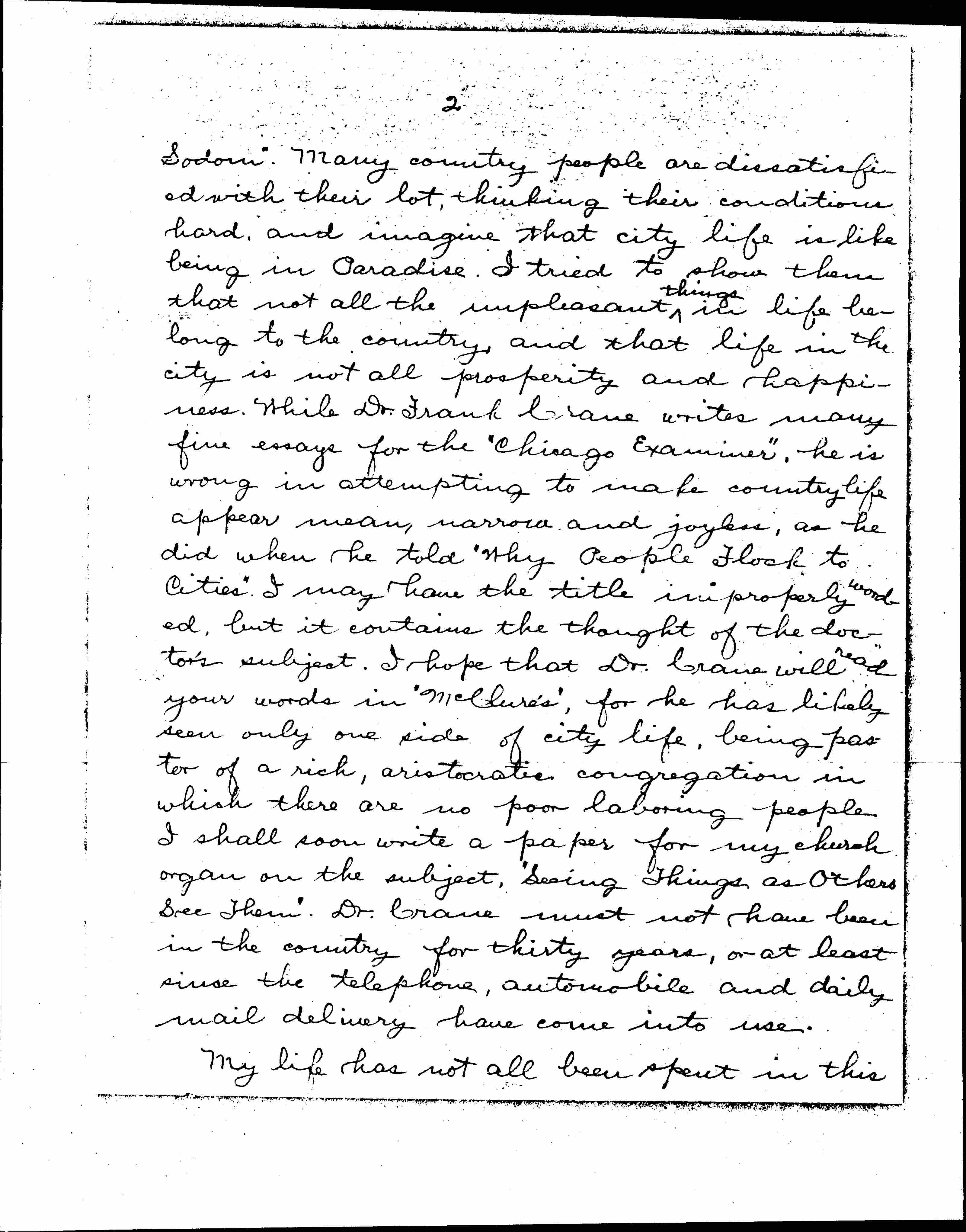 I am pastor of a little village church four miles west of Sterling. In both of my sermons, yesterday and a week ago, I referred to your article in "McClure's" and quoted from them. My text last evening was. "And Lot pitched his tent toward [page 2] Sodom." Many country people are dissatisfied with their lot, thinking their conditions hard, and imagine that city life is like being in Paradise. I tried to show them that not all the unpleasant things in life belong to the country, and that life in the city is not all prosperity and happiness. While Dr. Frank Crane writes many fine essays for the "Chicago Examiner," he is wrong in attempting to make country life appear mean, narrow, and joyless, as he did when he told "Why People Flock to Cities." I may have the title improperly worded, but it contains the thought of the doctor's subject. I hope that Dr. Crane will read your words in "McClure's," for he has likely seen only one side of city life, being pastor of a rich, aristocratic congregation in which there are no poor laboring people. I shall soon write a paper for my church organ on the subject, "Seeing Things as Others See Them." Dr. Crane must not have been in the country for thirty years, or at least since the telephone, automobile and daily mail delivery have come into use.
