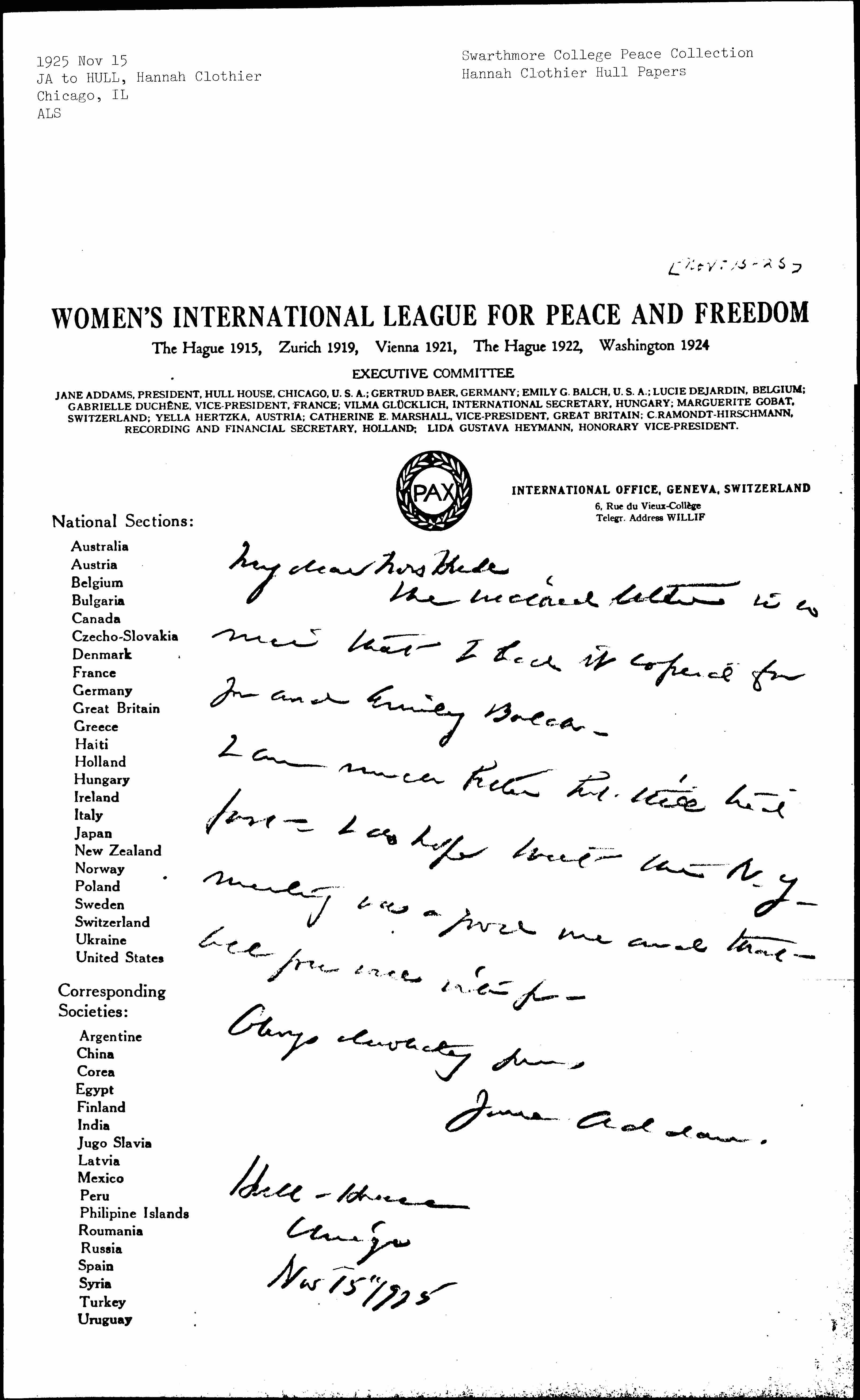 The [enclosed] letter is so nice that I had it copied for you and Emily Balch.