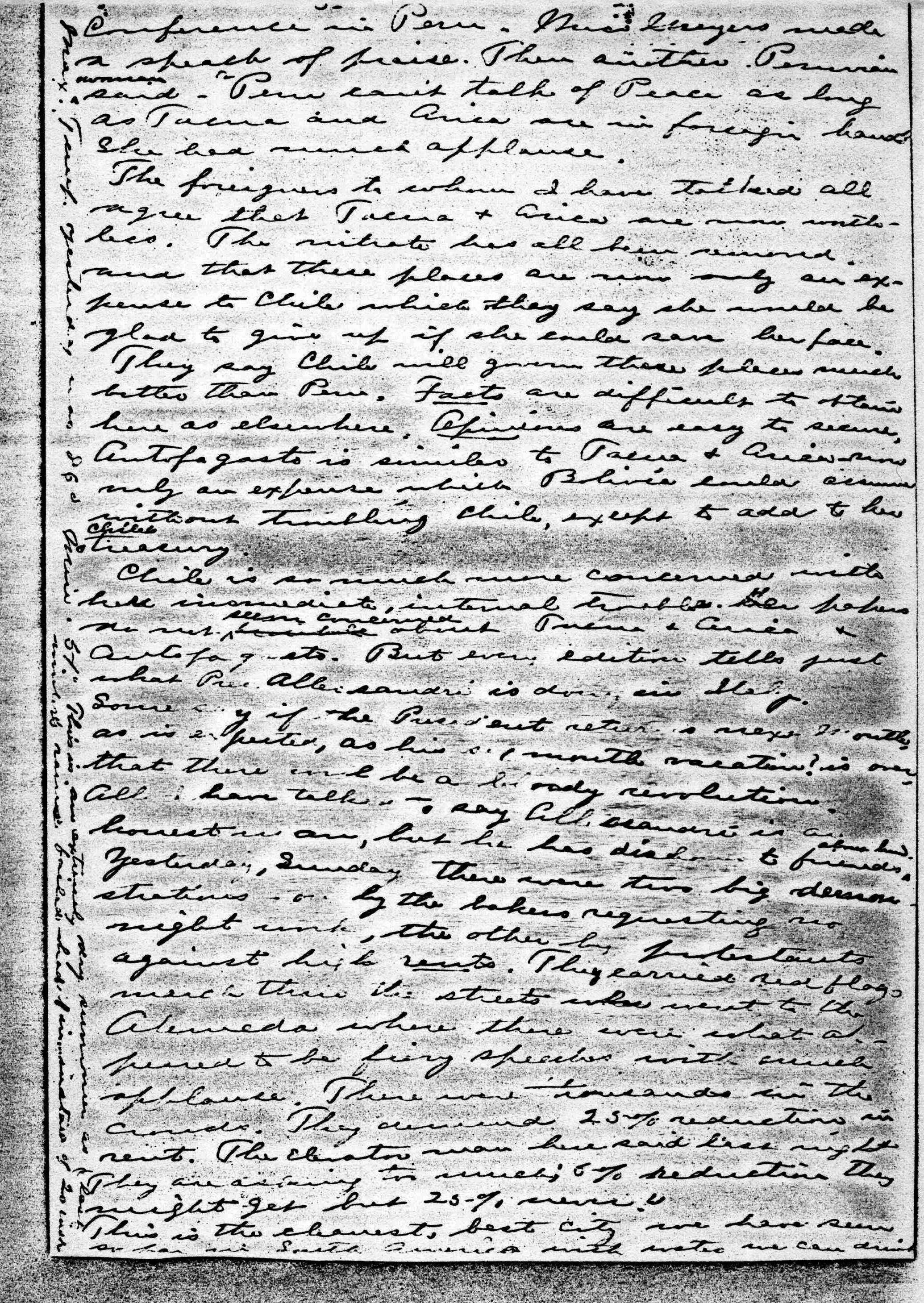 They say Chile will govern these places much better than Peru. Facts are difficult to obtain here as elsewhere. Opinions are easy to secure. Antofagasta is similar to Tacna & Arica -- now only an expense which Bolivia could assume without troubling Chile, except to add to her ↑Chile's↓ treasury.
