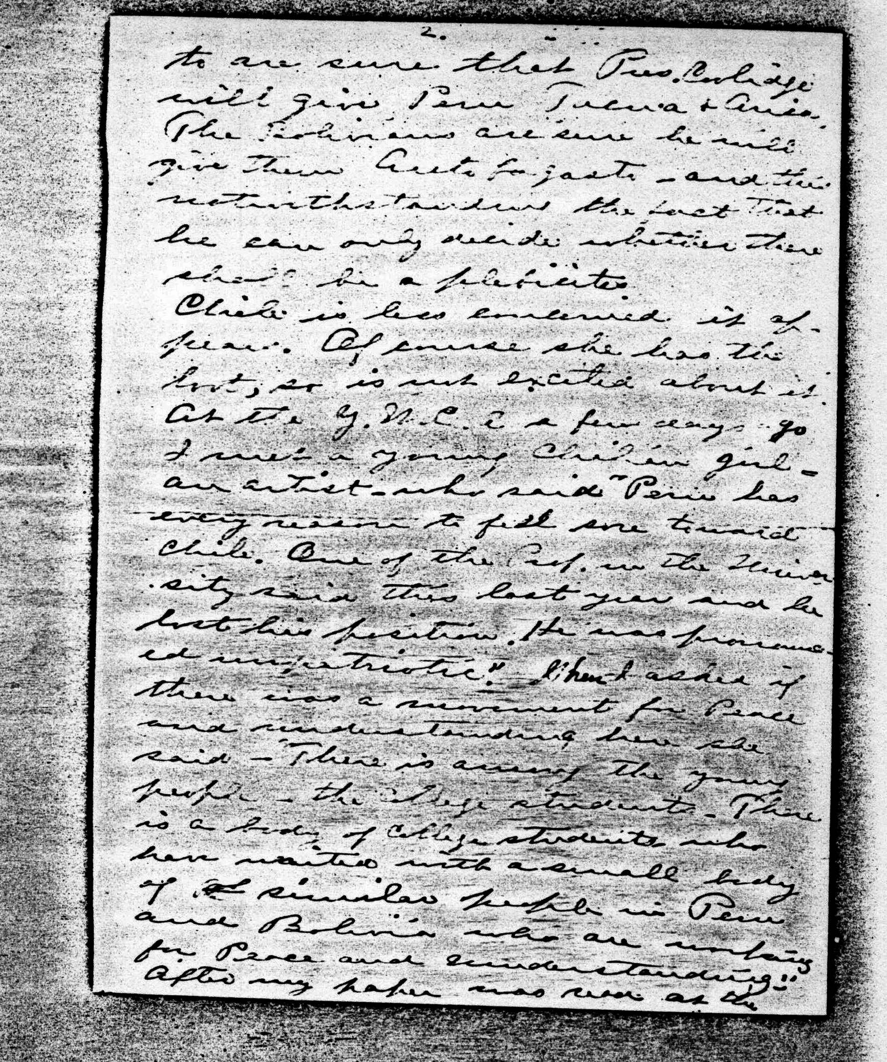 Chile is less concerned it appears. Of course she has the loot, so is not excited about it. At the Y.W.C.A. a few days ago I met a young Chilean girl -- an artist -- who said "Peru has every reason to feel sore toward Chile. One of the Prof. in the university said this last year and he lost his position. He was pronounced unpatriotic." When I asked if there was a movement for Peace and understanding here she said -- "There is among the young people -- the college students who have united with a small body of [illegible] similar people in Peru and Bolivia who are working for Peace and understanding."