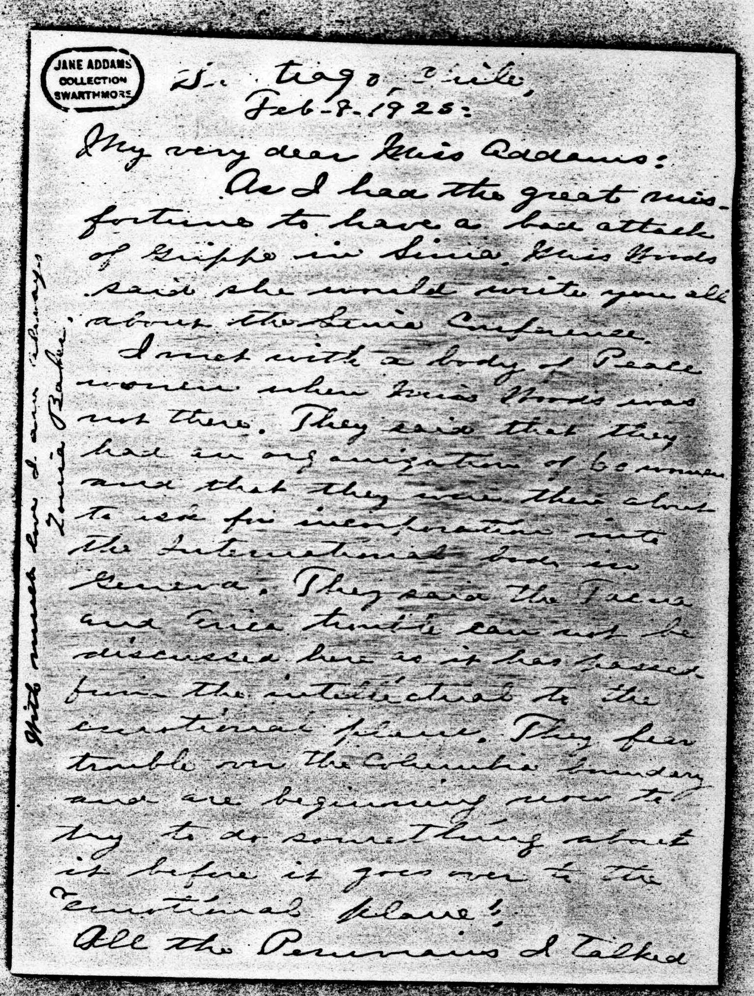 I met with a body of Peace women when Miss Woods was not there. They said that they had an organization of 60 women and that they were then about to ask you for incorporation into the International body in Geneva. They said the Tacna and Arica trouble cannot be discussed here as it has passed from the intellectual to the emotional plane. They fear trouble over the Columbia boundary and are beginning now to try to do something about it before it goes over to the "emotional plane."
