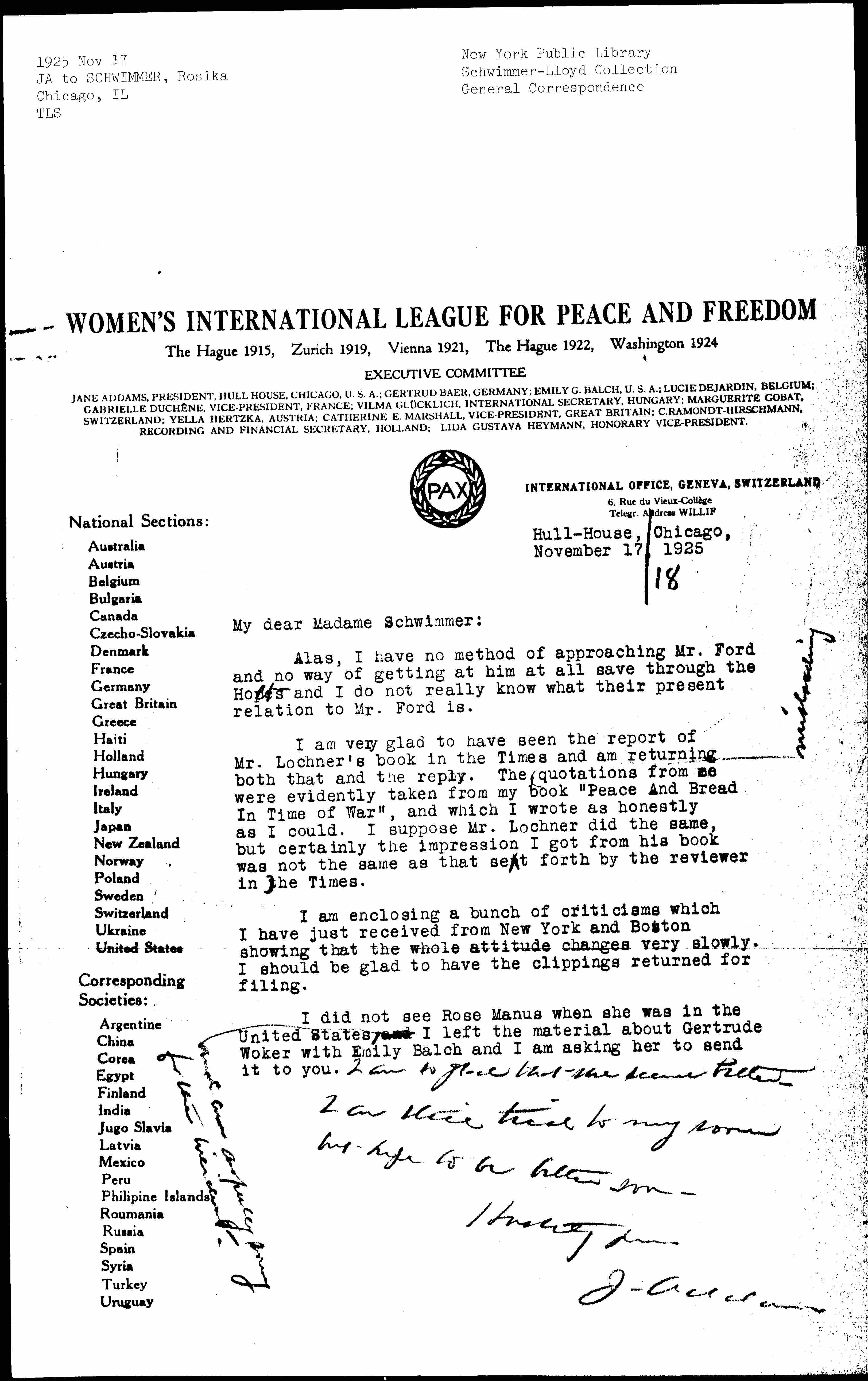 I did not see Rose Manus when she was in the United States and ↑and am awfully sorry for the incident.↓ I left the material about [Gertrud] Woker with Emily Balch and I am asking her to send it to you. ↑I am so glad that she seems better. I am still tied to my room but hope to be better soon.