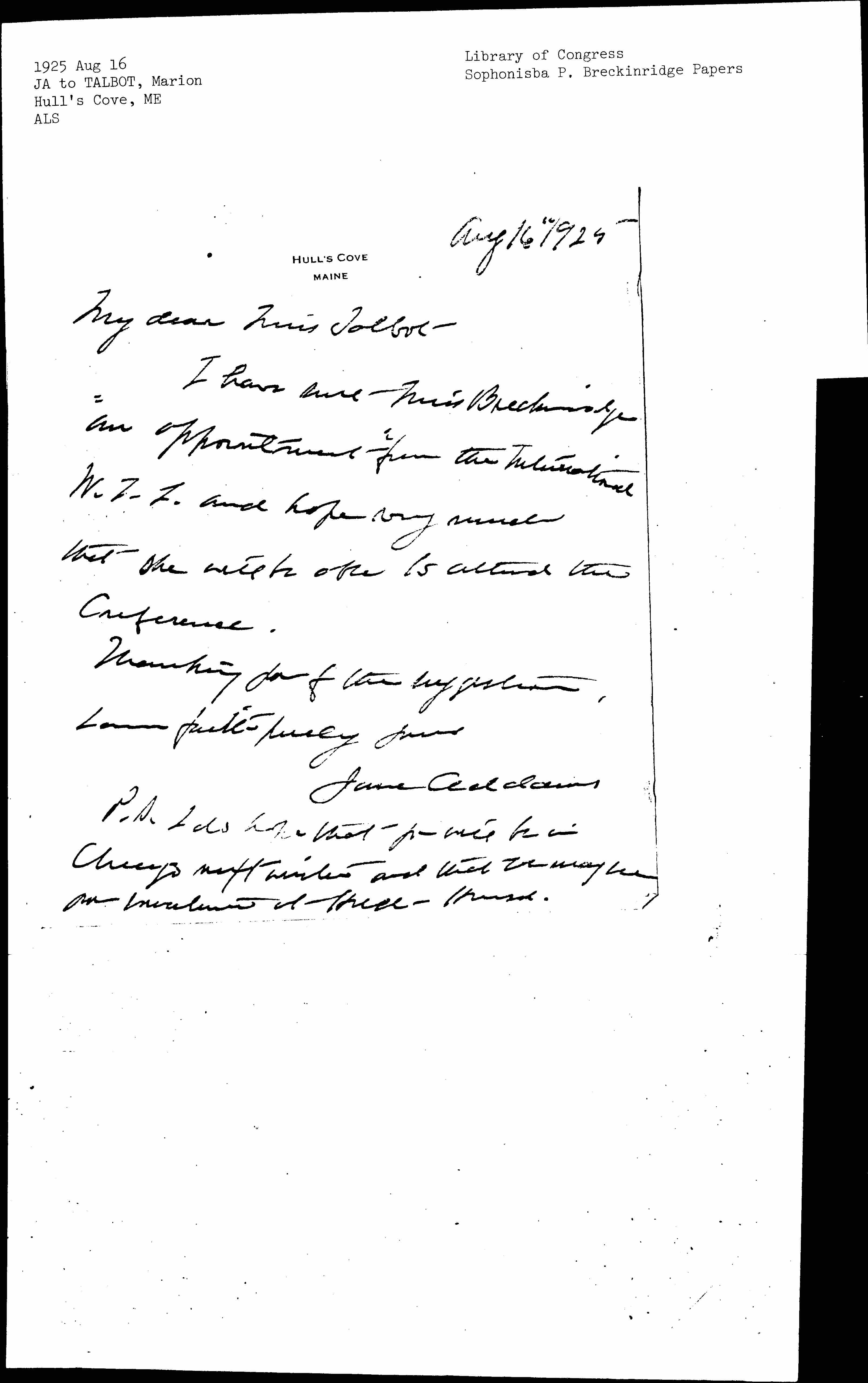 P.S. I do hope that you will be in Chicago next winter and that we may see you sometime at Hull-House.