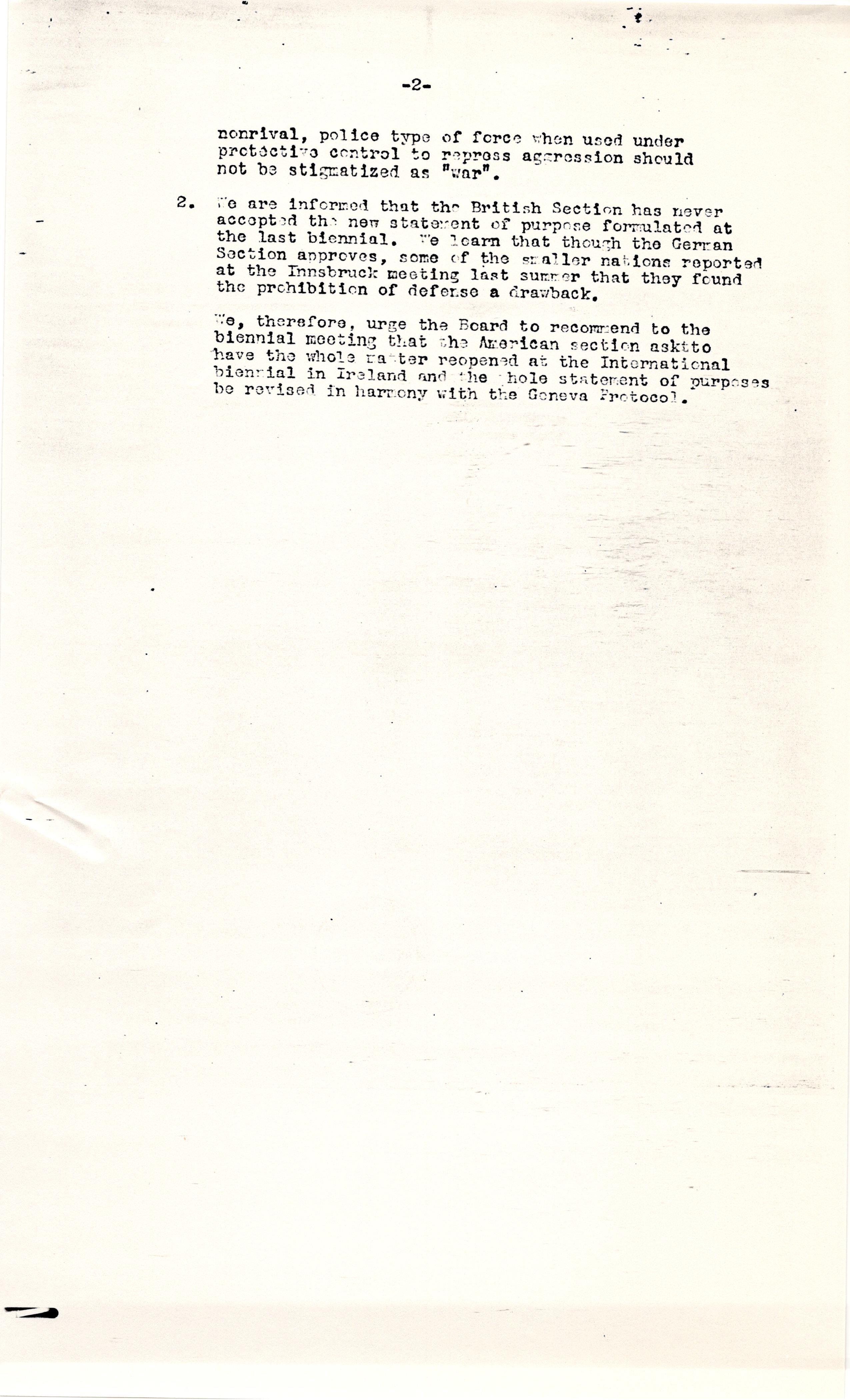 We, therefore, urge the Board to recommend to the biennial meeting that the American section [asks] to have the whole matter reopened at the International biennial in Ireland and the whole statement of purpose be revised in harmony with the Geneva Protocol.