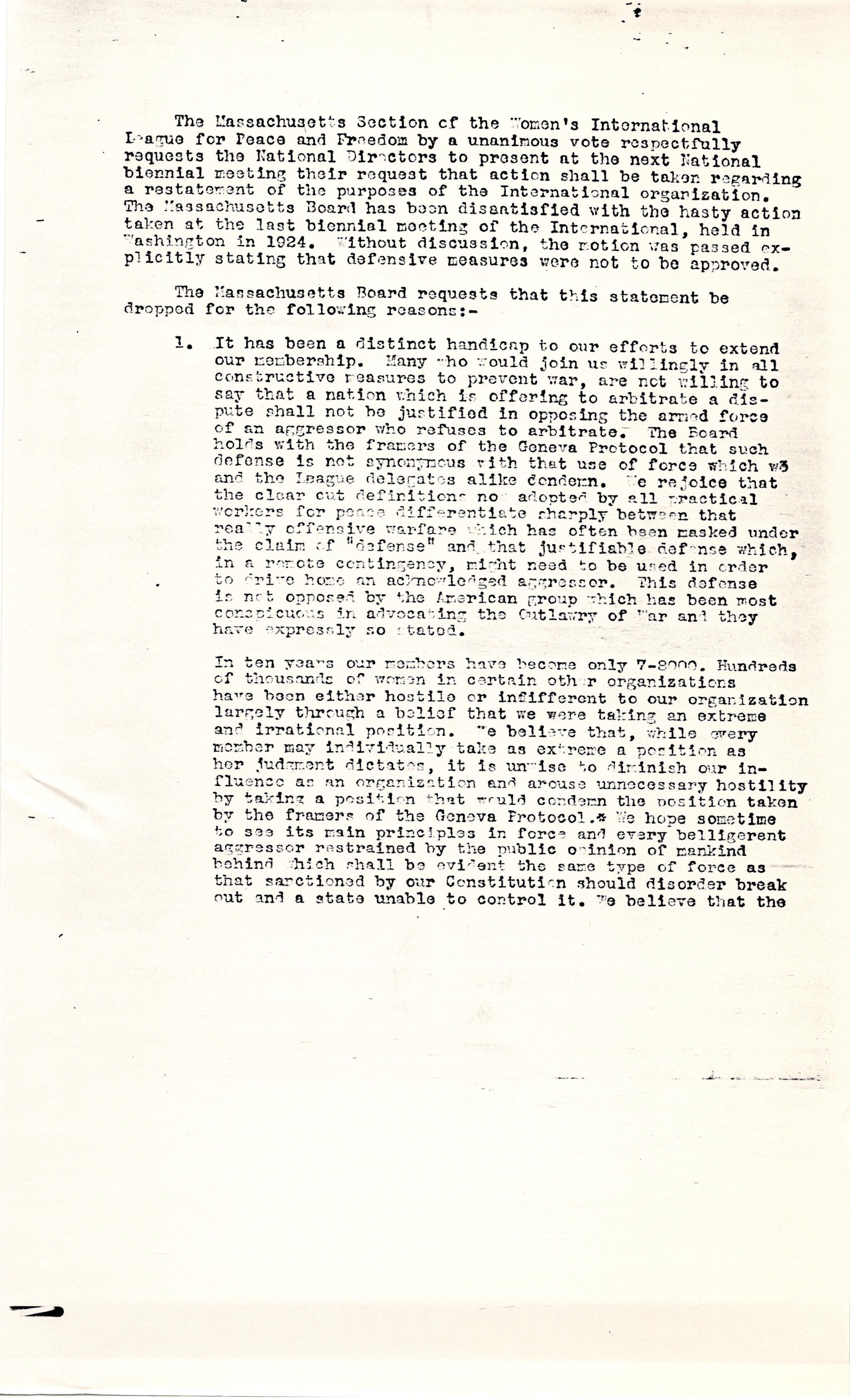 The Massachusetts Section of the Women's International League for Peace and Freedom by a unanimous vote respectfully requests the National Directors to present at the next National biennial meeting their request that action be taken regarding a restatement of the purposes of the International organization. The Massachusetts Board has been dissatisfied with the hasty action taken at the last biennial meeting of the International, held in Washington in 1924. Without discussion, the motion was passed explicitly stating that defensive measures were not be approved.