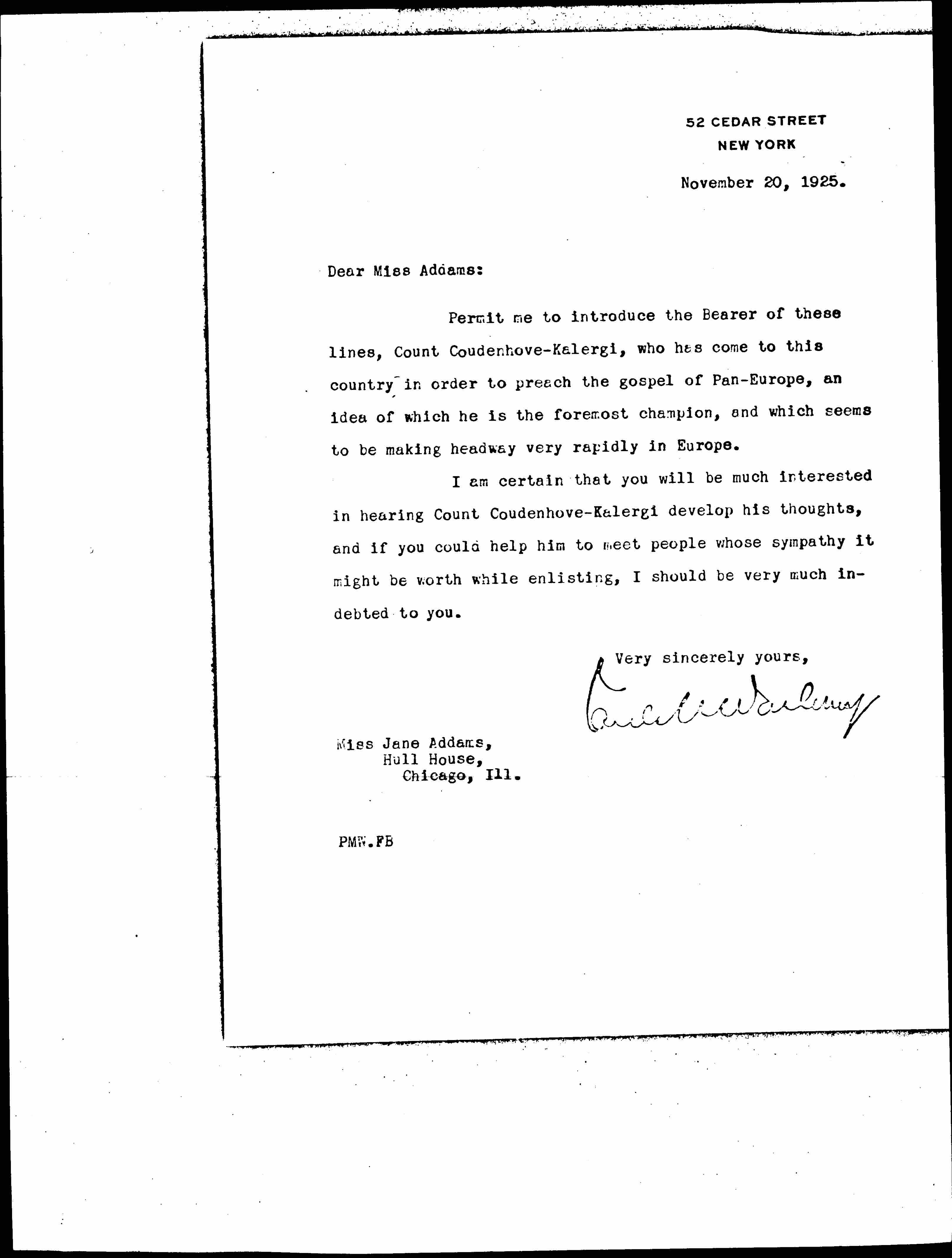 Permit me to introduce the Bearer of these lines, Count Coudenhove-Kalergi, who has come to this country in order to preach the gospel of Pan-Europe, an idea of which he is the foremost champion, and which seems to be making headway very rapidly in Europe.