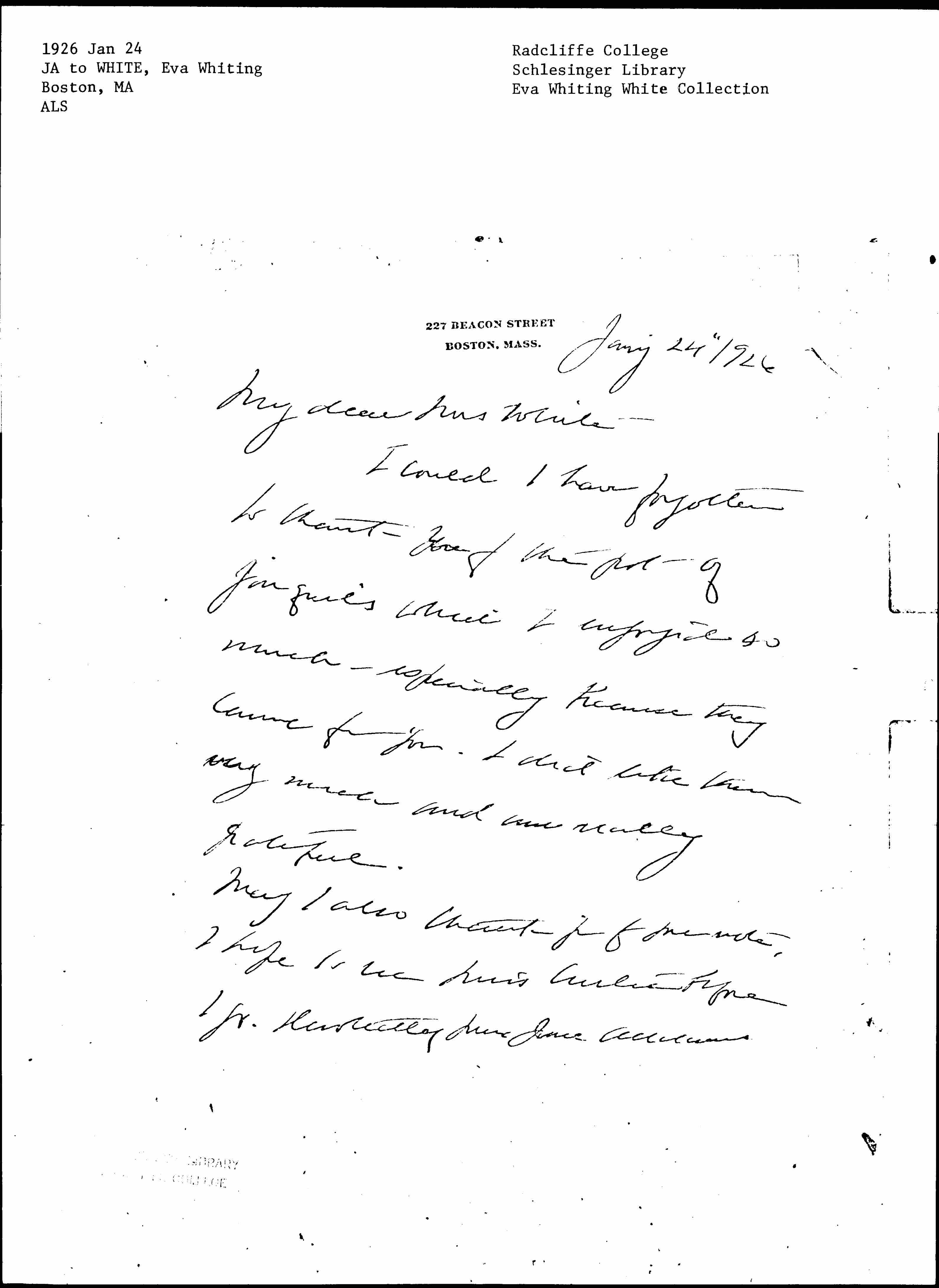 May I also thank you for your note. I hope to see Miss Curtis before I go. Devotedly yours Jane Addams