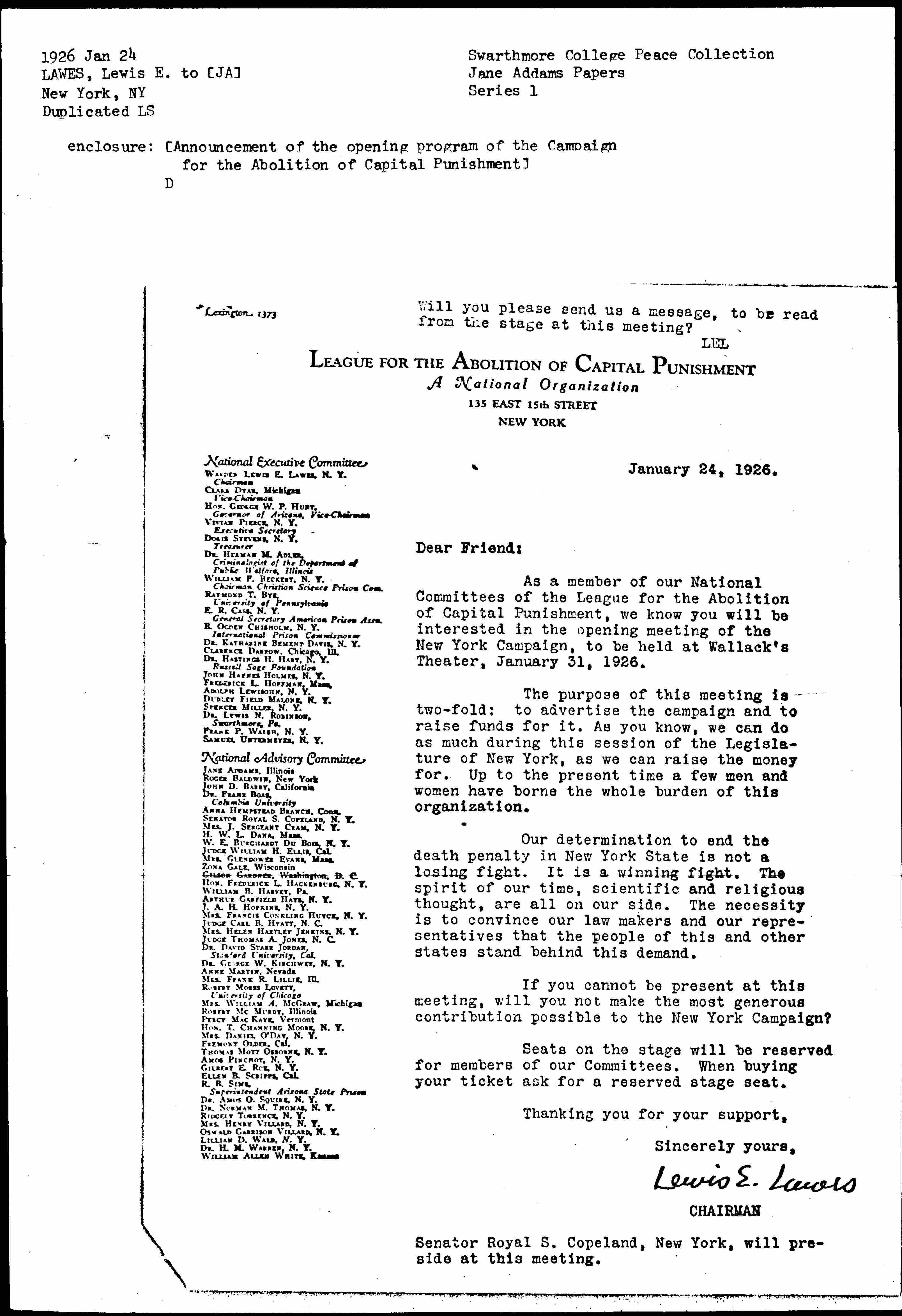 As a member of our National Committees of the League for the Abolition of Capital Punishment, we know you will be interested in the opening meeting of the New York Campaign, to be held at Wallack's Theater, January 31, 1926.