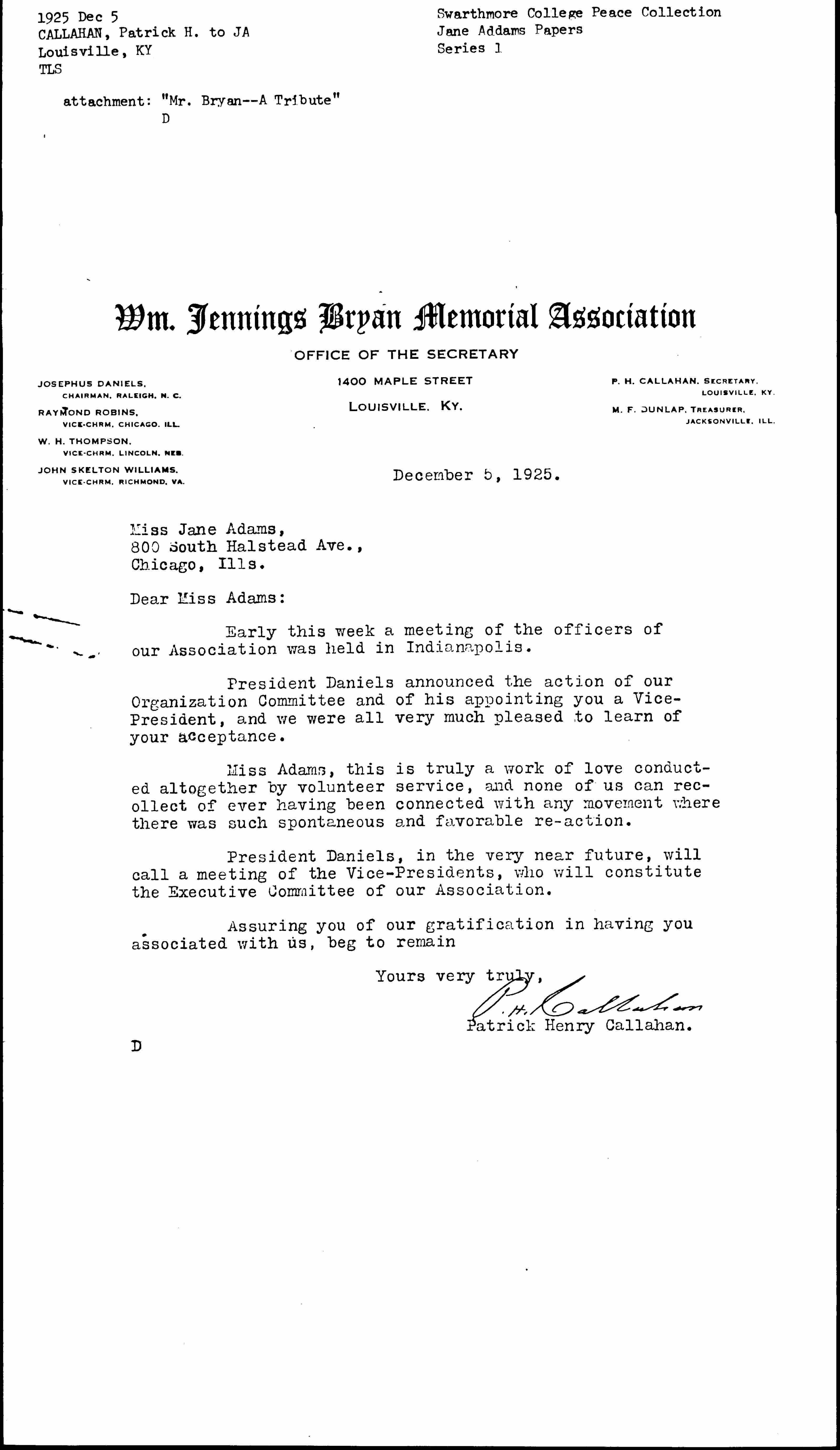 Miss [Addams], this is truly a work of love conducted altogether by volunteer service, and none of us can recollect of ever having been connected with any movement where there was such spontaneous and favorable [reaction].