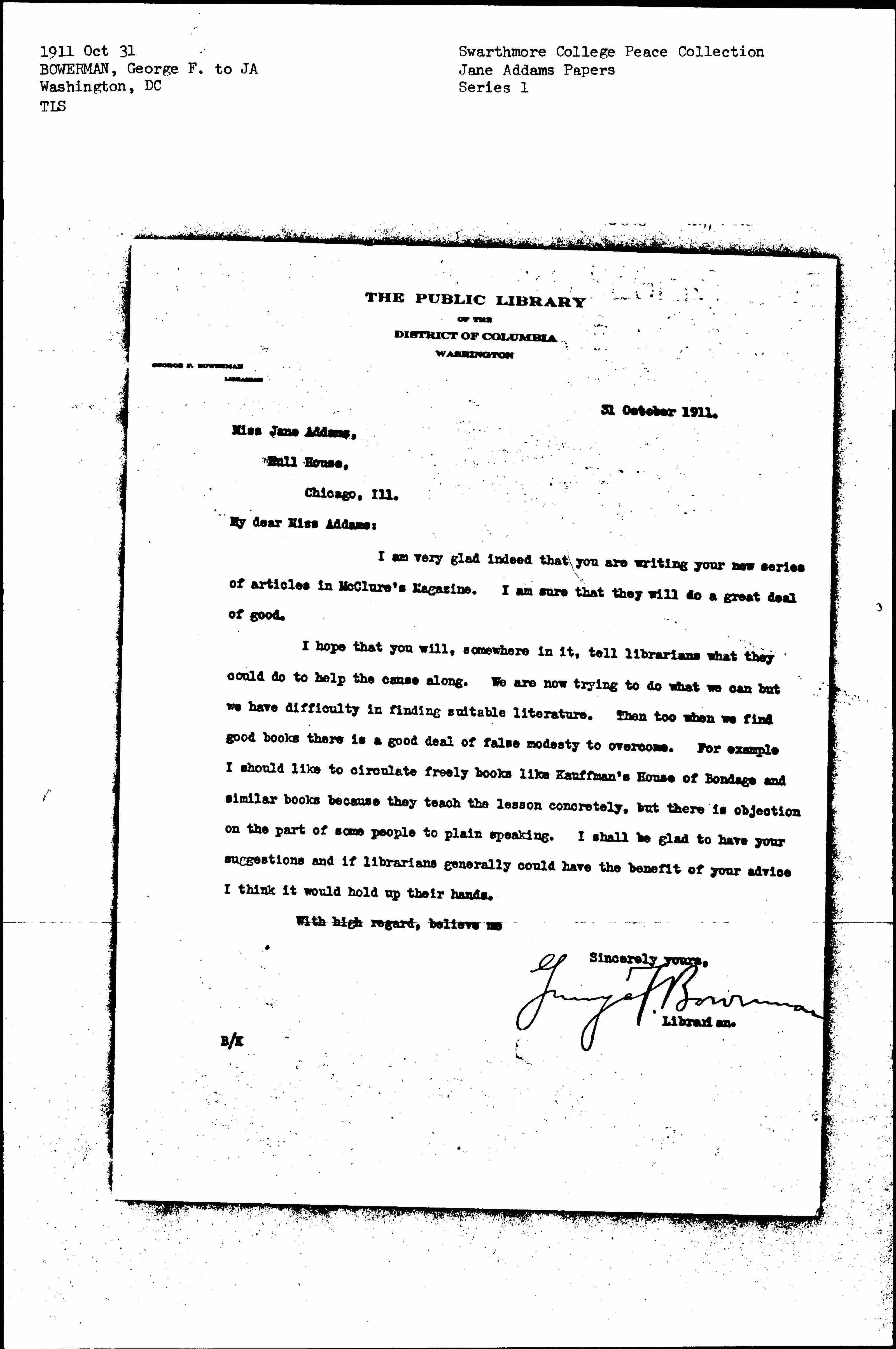 I hope that you will, somewhere in it, tell librarians what they could do to help the cause along. We are now trying to do what we can but we have difficulty in finding suitable literature. Then too when we find good books there is a good deal of false modesty to overcome. For example I should like to circulate freely books like Kauffman's House of Bondage and similar books because they teach the lesson concretely, but there is objection on the part of some people to plain speaking. I shall be glad to have your suggestions and if librarians generally could have the benefit of your advice I think it would hold up their hands.