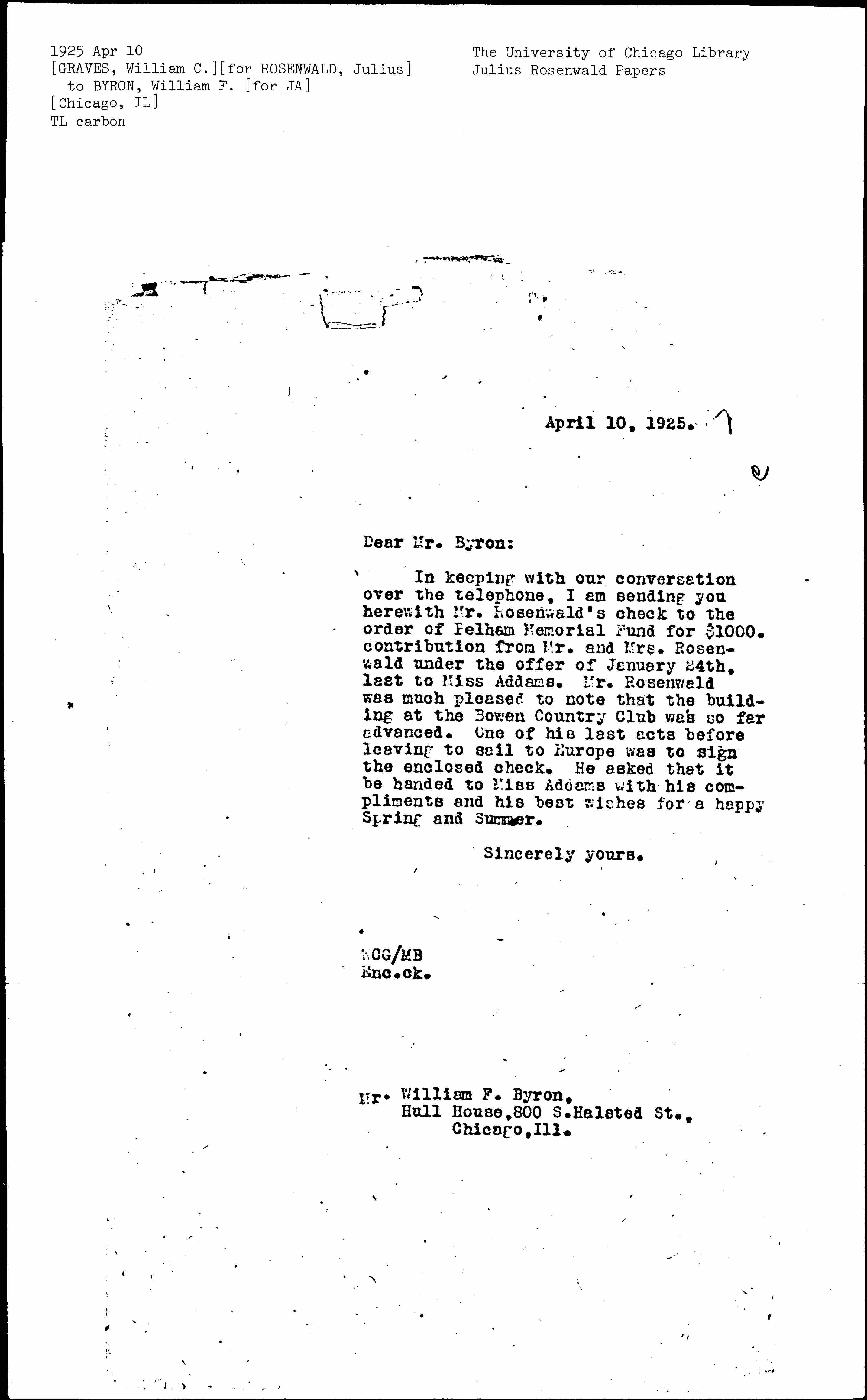 In keeping with our conversation over the telephone, I am sending you herewith Mr. Rosenwald's check to the order of Pelham Memorial Fund for $1000 contribution from Mr. and Mrs. Rosenwald under the offer of January 24th, last to Miss Addams. Mr. Rosenwald was much pleased to note that the building at the Bowen Country Club was so far advanced. One of his last acts before leaving to sail to Europe was to sign the enclosed check. He asked that it be handed to Miss Addams with his compliments and his best wishes for a happy Spring and Summer.