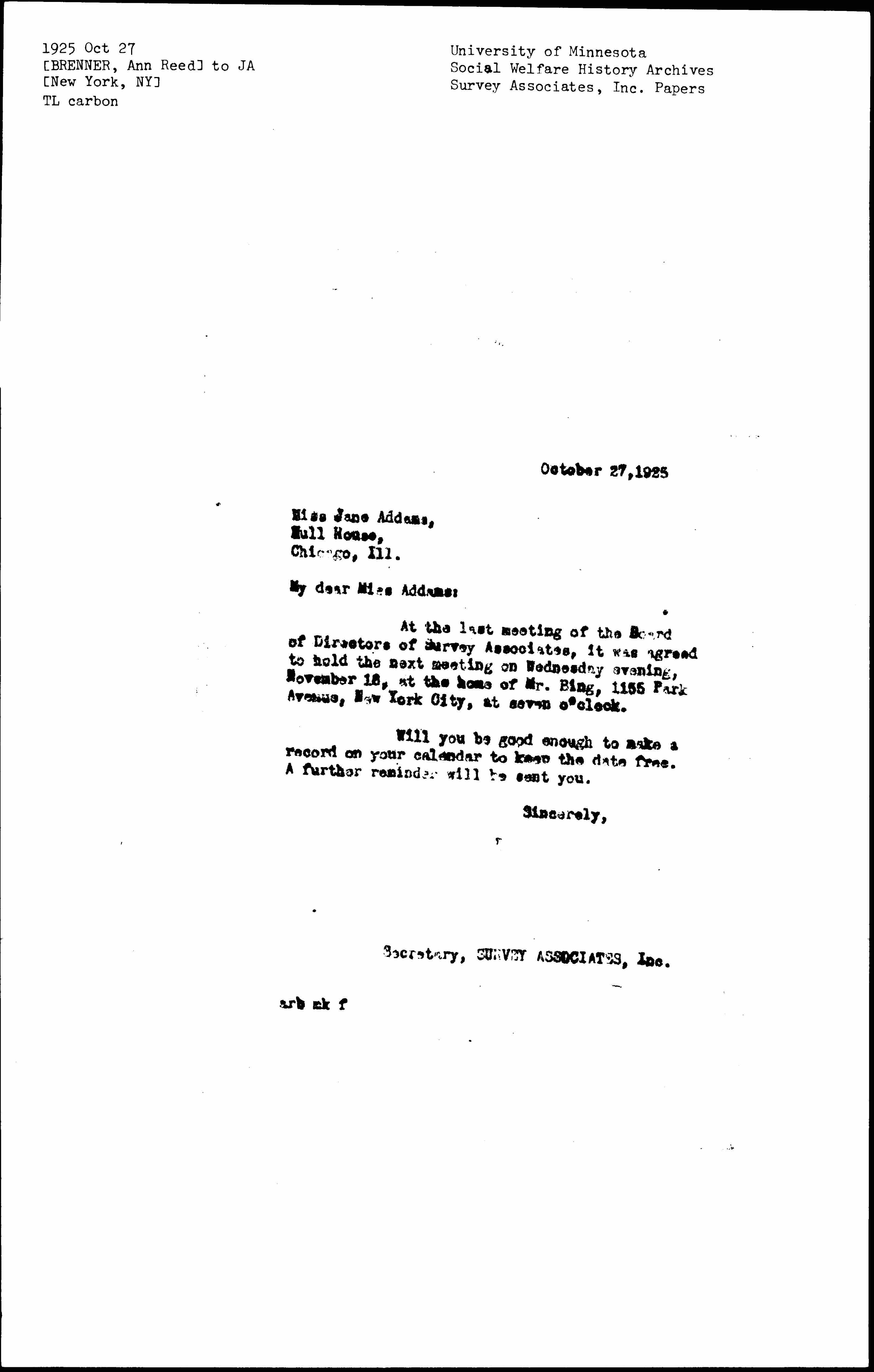 At the last meeting of the Board of Directors of Survey Associates, it was agreed to hold the next meeting on Wednesday evening, November 18, at the home of Mr. Bing, 1155 Park Avenue, New York City, at seven o'clock.